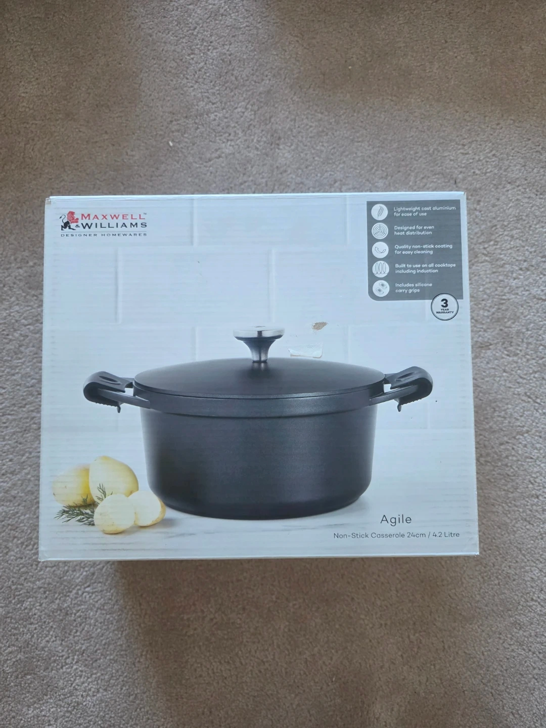 Maxwell & Williams Agile non-stick casserole. It's made of lightweight cast aluminium for even heat distribution. It's built for all cooktops, including induction, and includes silicone carry grips. This casserole is great for everyday cooking needs!