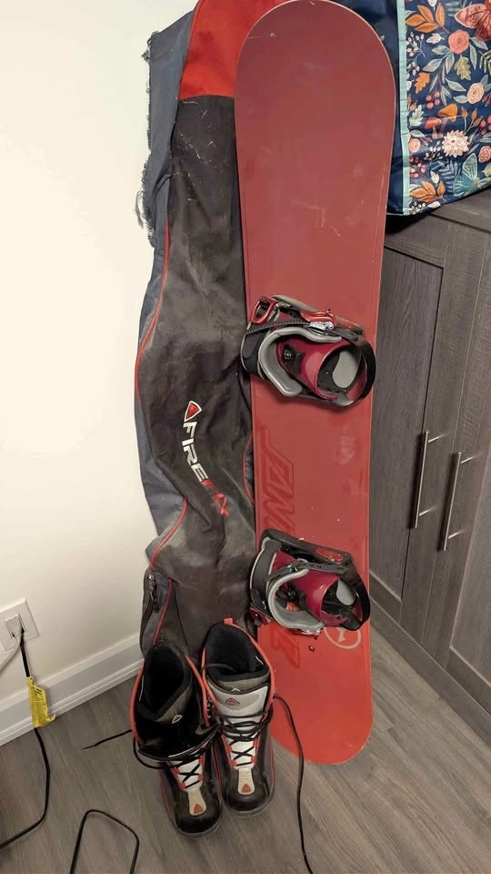 Cool Firefly snowboard set with red snowboard and bindings. Black and red boots and Firefly snowboard bag included. Boots and bindings are size 12. Board is 62" tall.