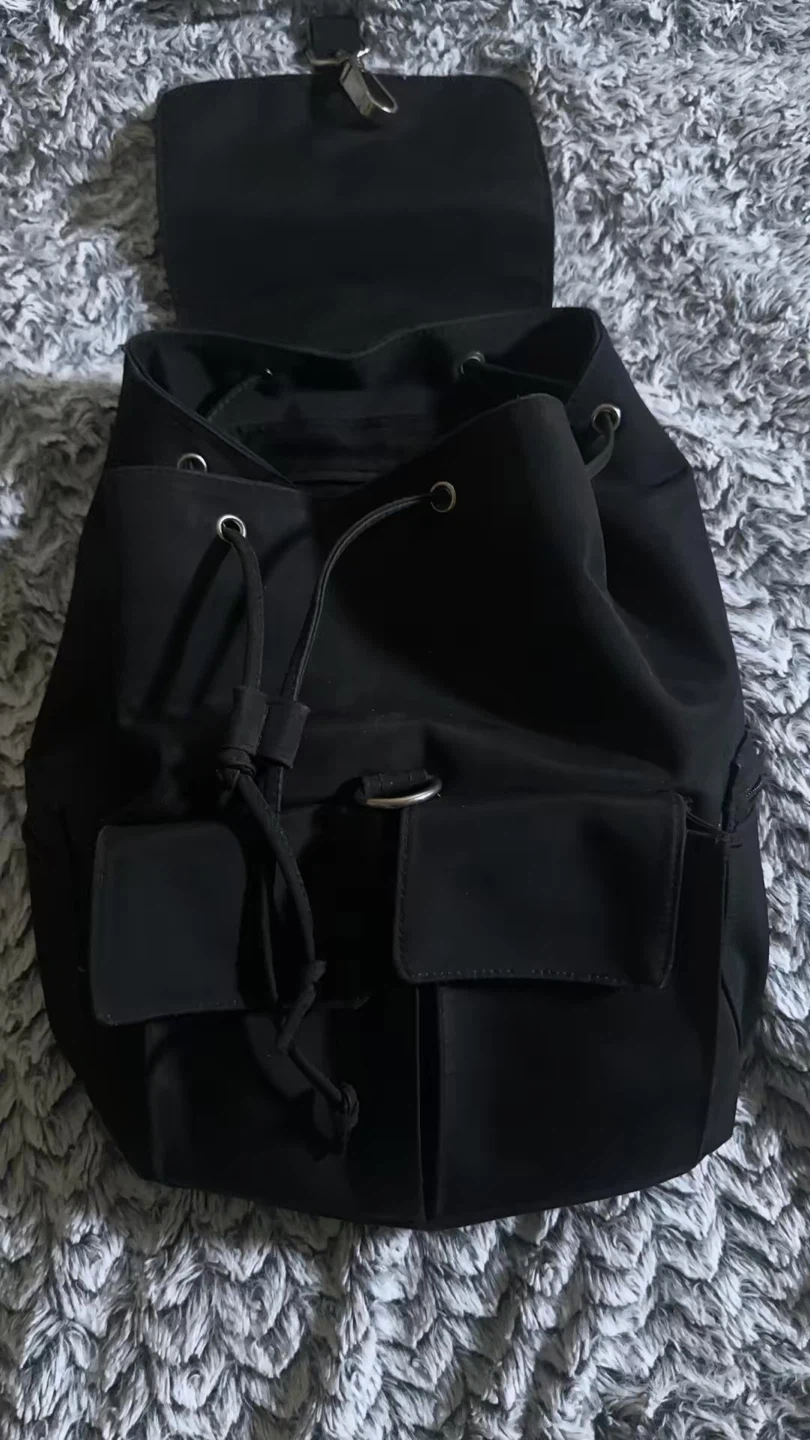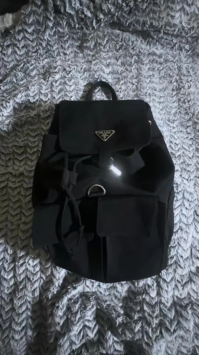 This is a black Prada backpack made from nylon. It features a drawstring closure and multiple exterior pockets. The iconic Prada logo is visible on the front.