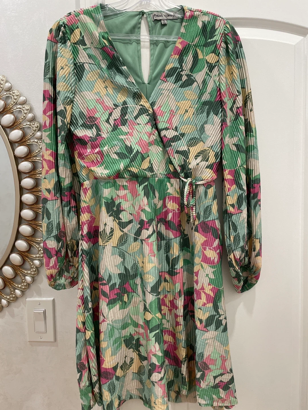 Absolutely Famous midi wrap dress in a size small. It features a vibrant floral print with pleats throughout. Dress has long sleeves and a tie waist.