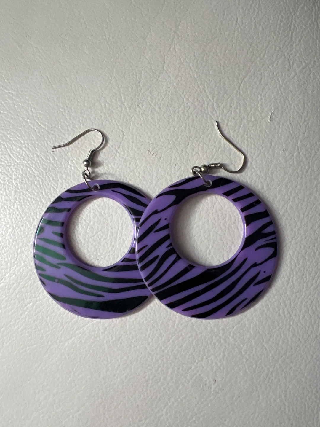 Fun hoop earrings with a purple and black zebra print design. They're made of a lightweight plastic material. These earrings would add a pop of colour to any outfit!