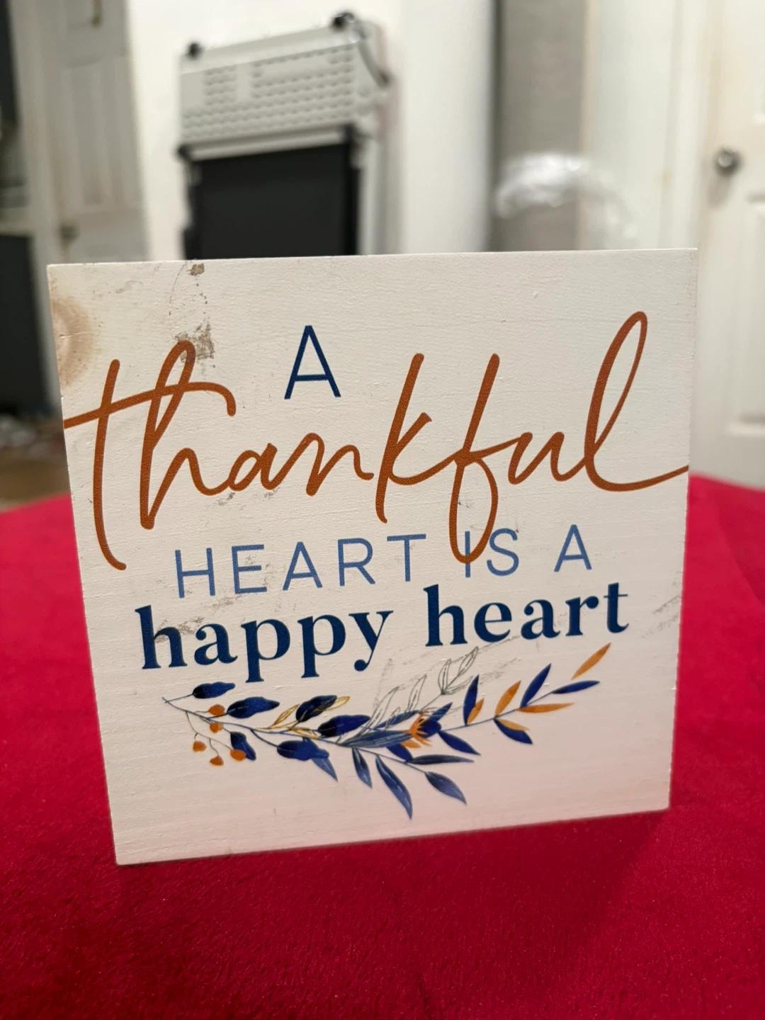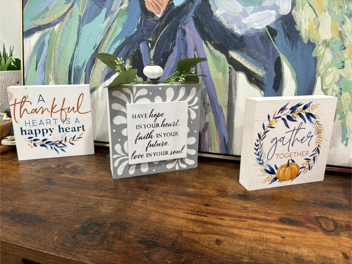 Three decorative wooden blocks featuring inspirational quotes and autumn-themed designs. One block reads "A thankful heart is a happy heart." Another states "Have hope in your heart, faith in your future, love in your soul." The third says "gather TOGETHER" with a pumpkin graphic. Made in the USA.