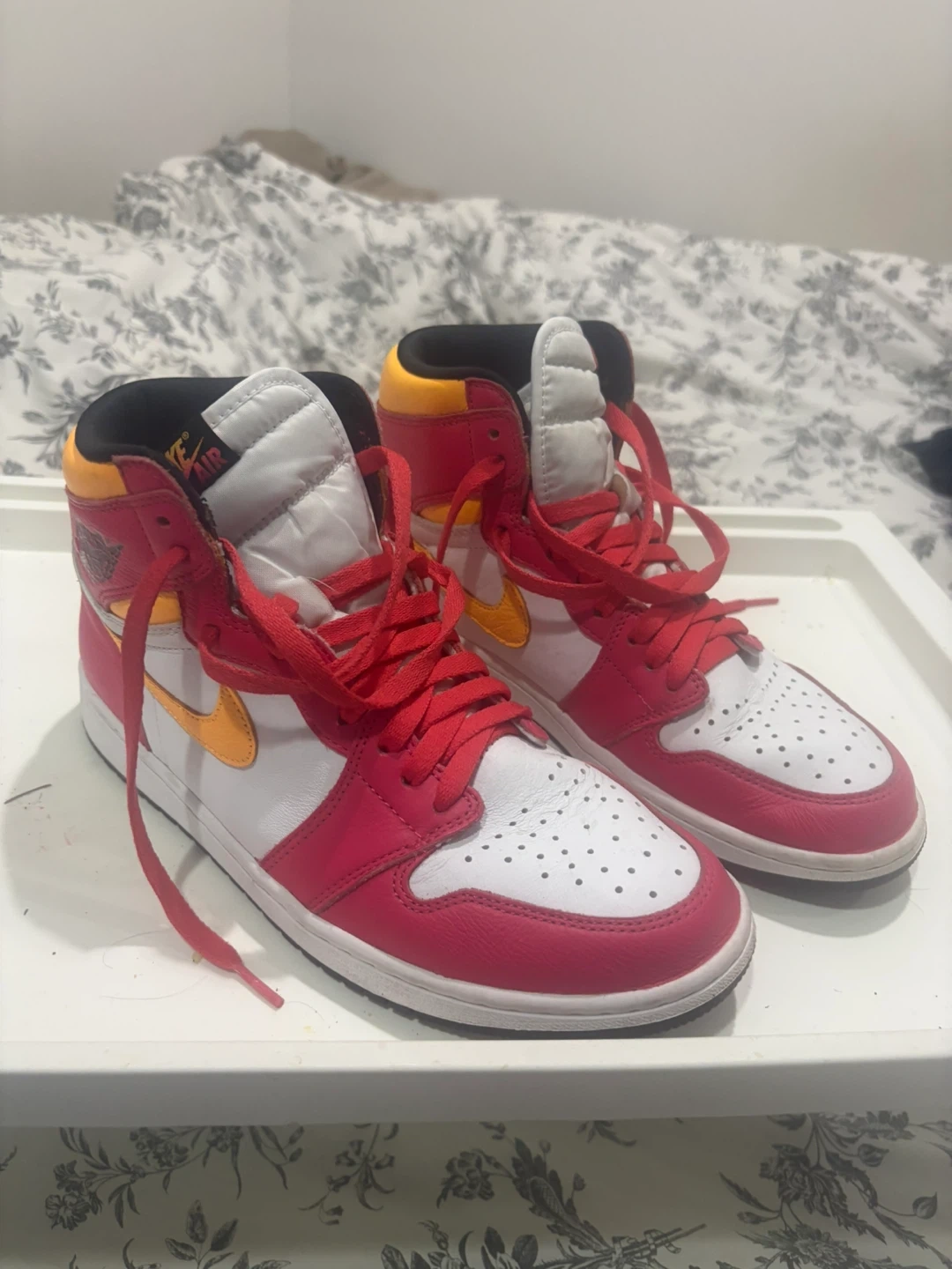 These are a pair of Air Jordan 1 High sneakers in the "Top 3" colourway. They're a high-top design. They feature red, white, and yellow accents.