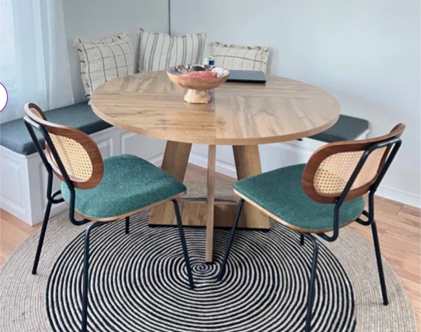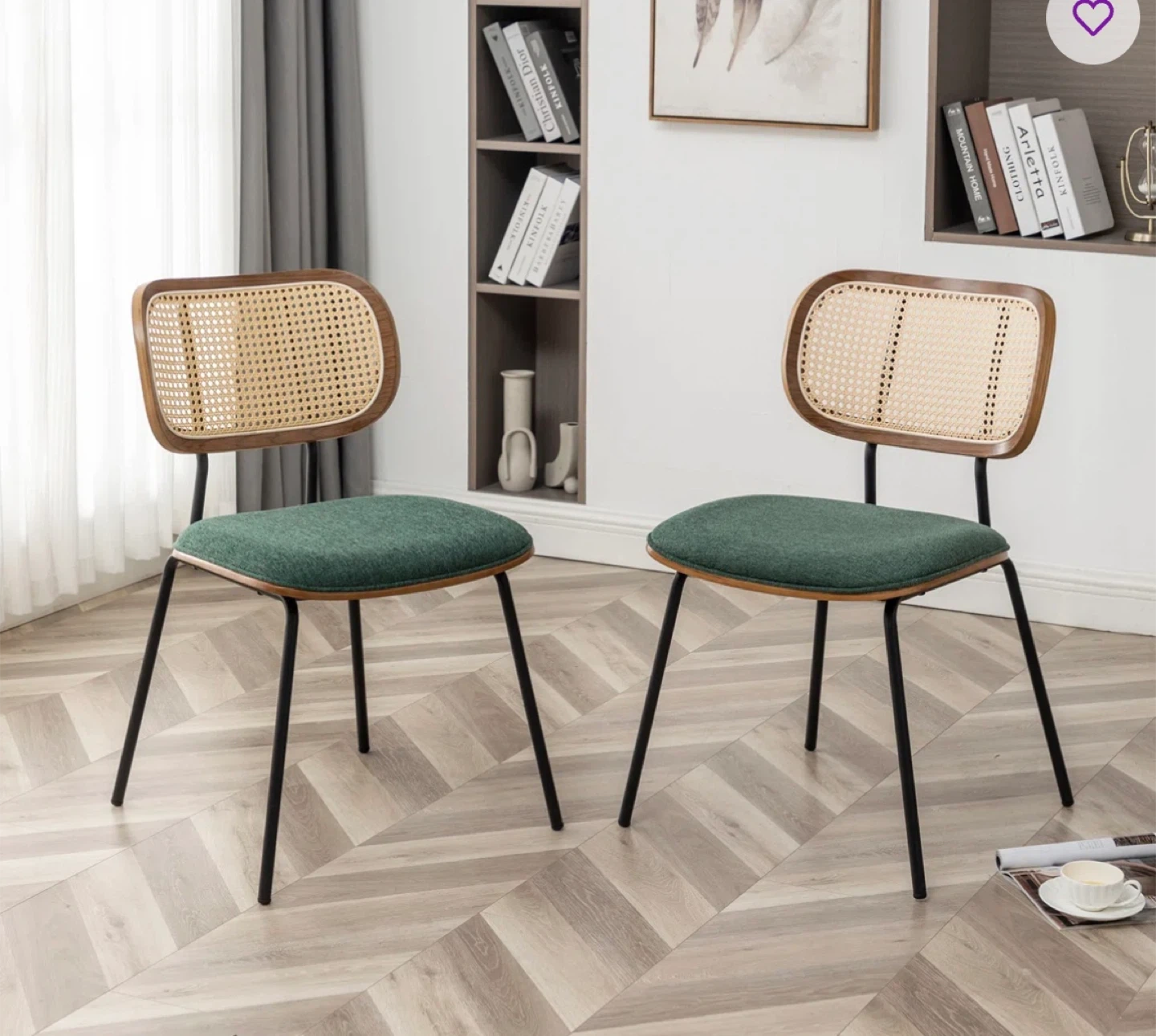 60Looking to sell two Sirine Linen Modern Side Chairs with Rattan Back from Bay Isle Home. These chairs feature a comfortable green upholstered seat and a rattan back. Dimensions are approximately 18.5" wide, 15" high (back), 18.9" wide (seat), and 32.3" high overall. Originally bought for $349.99.