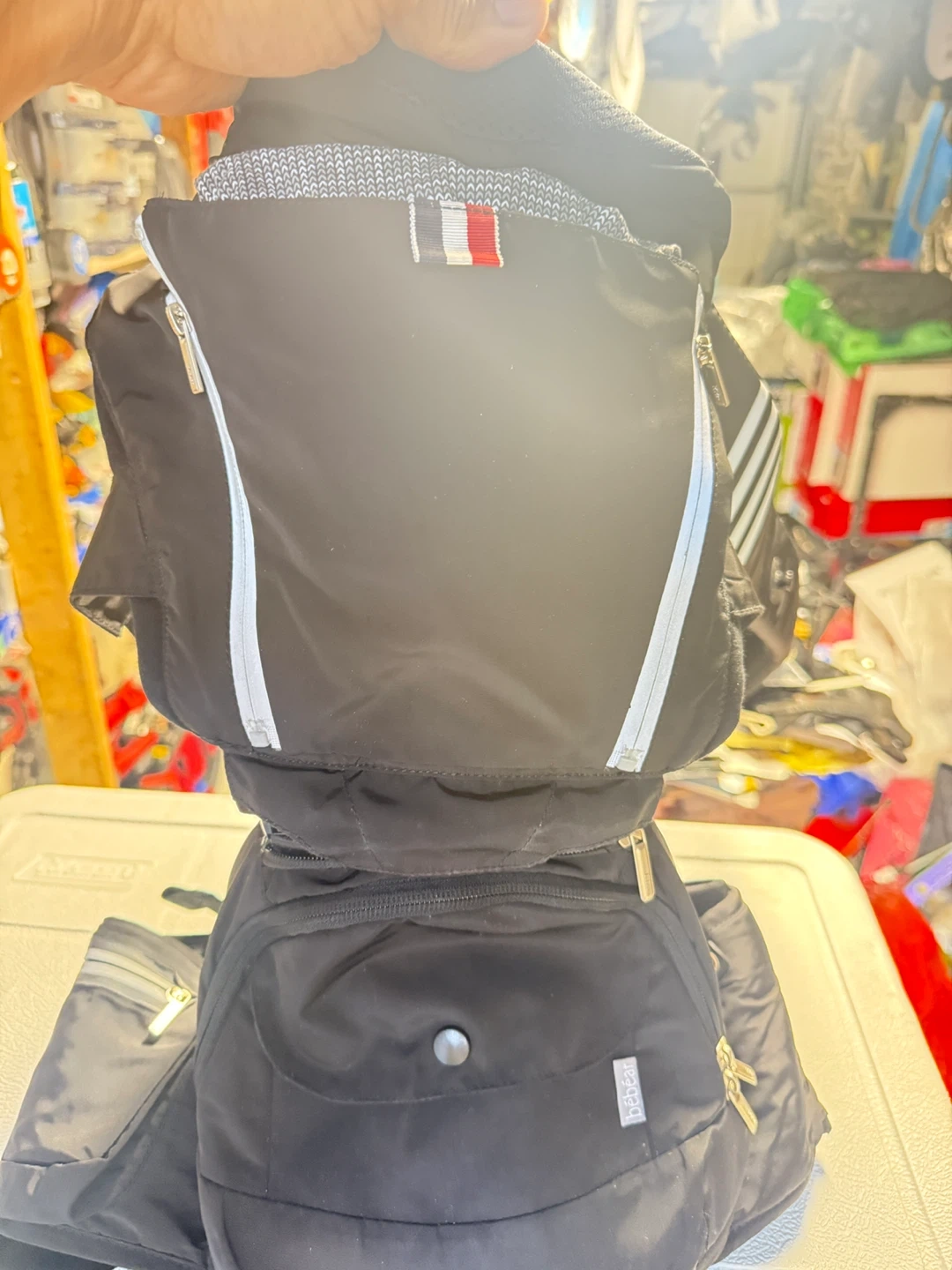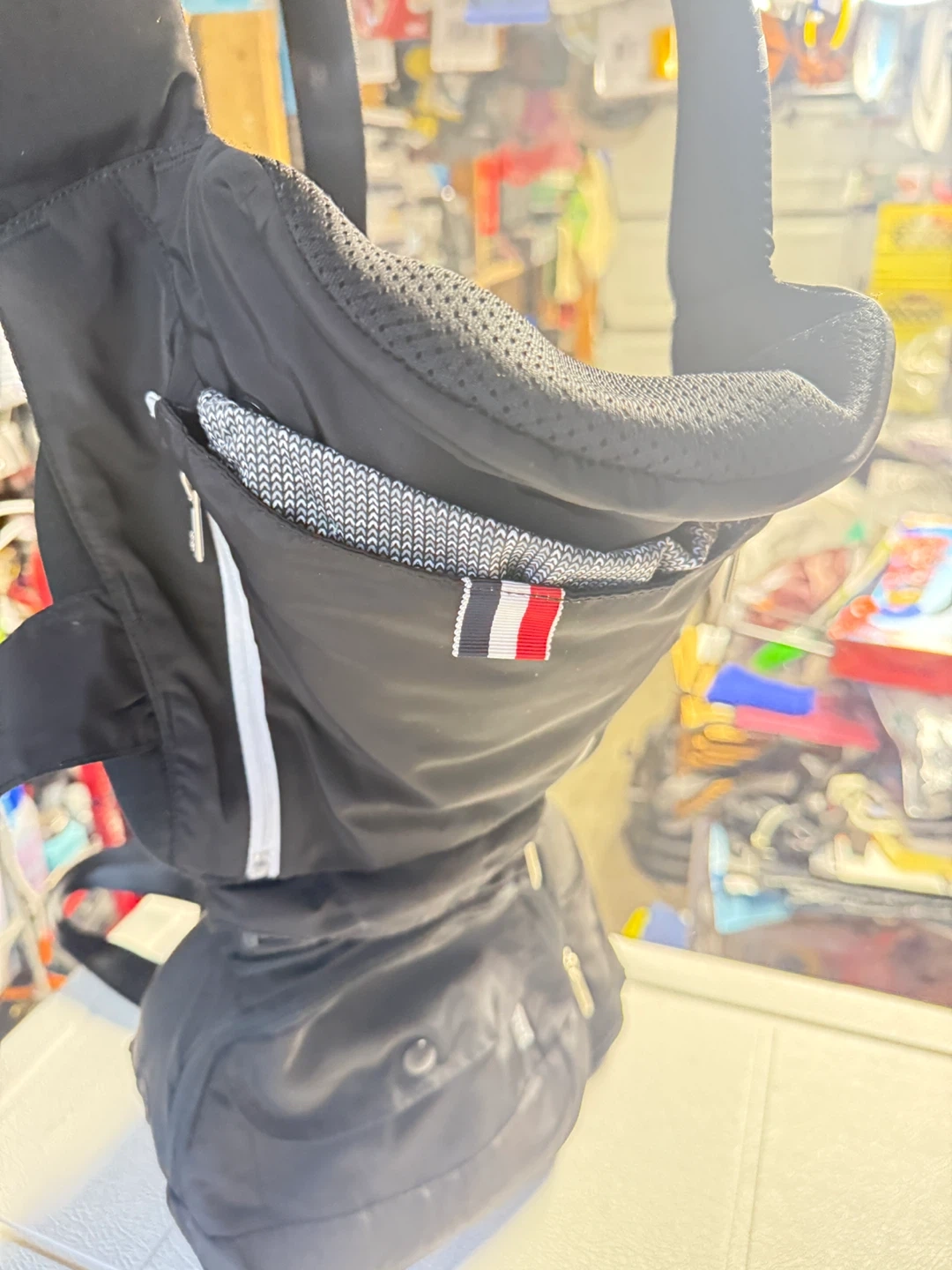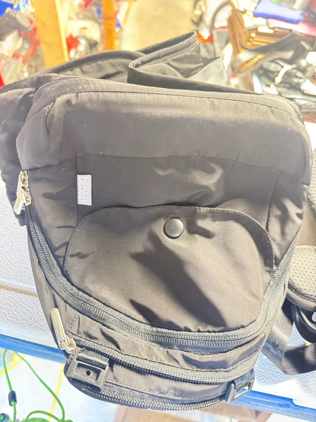 Selling a Bébéar baby carrier in black. It features a stylish design with a comfortable padded interior for baby's comfort. The carrier also has multiple pockets for storage and adjustable straps for a secure fit. Perfect for keeping your little one close while on the go!