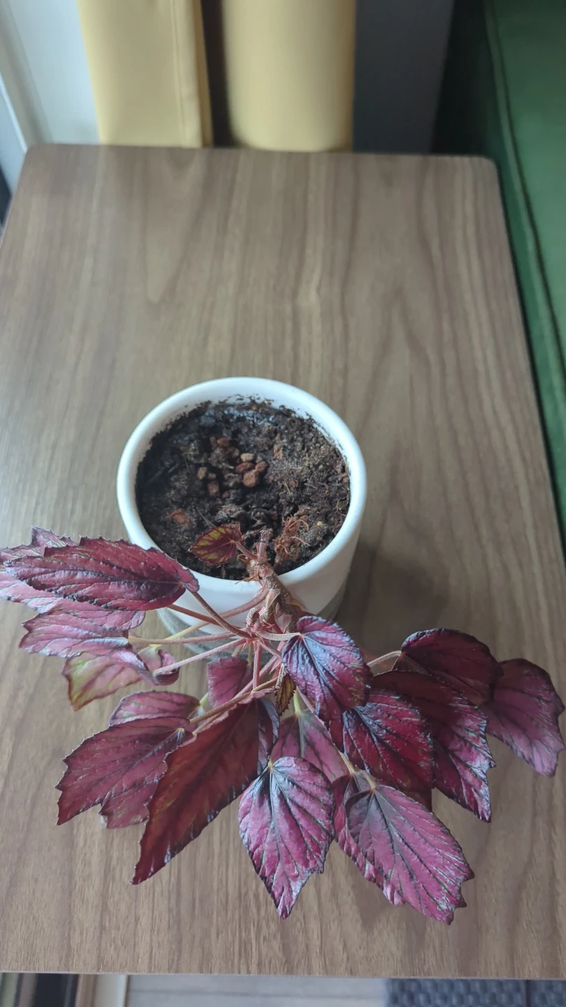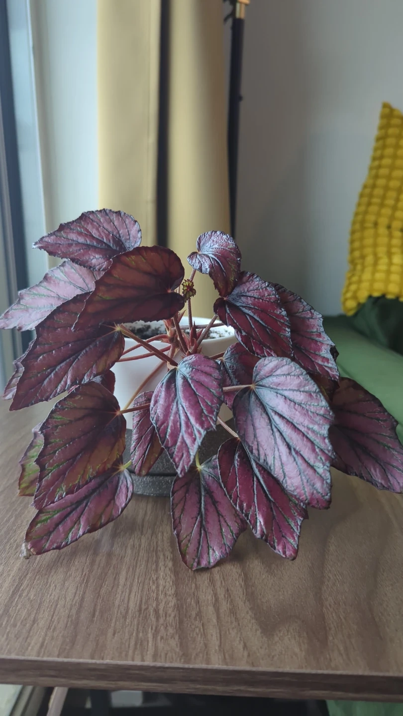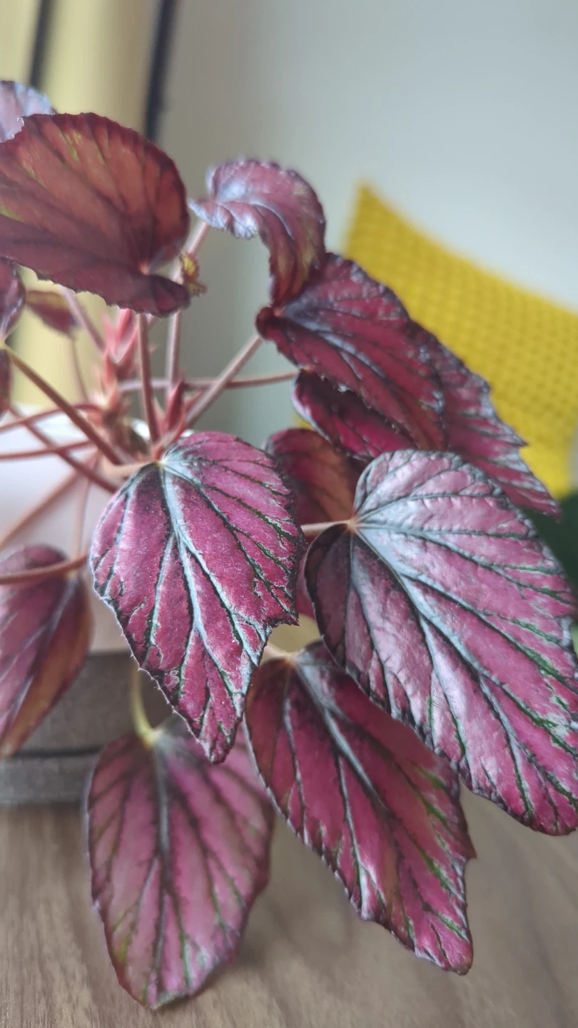 This is a begonia plant with striking red and silver leaves. It's potted in a simple white ceramic planter. Adds a nice splash of colour to any room!