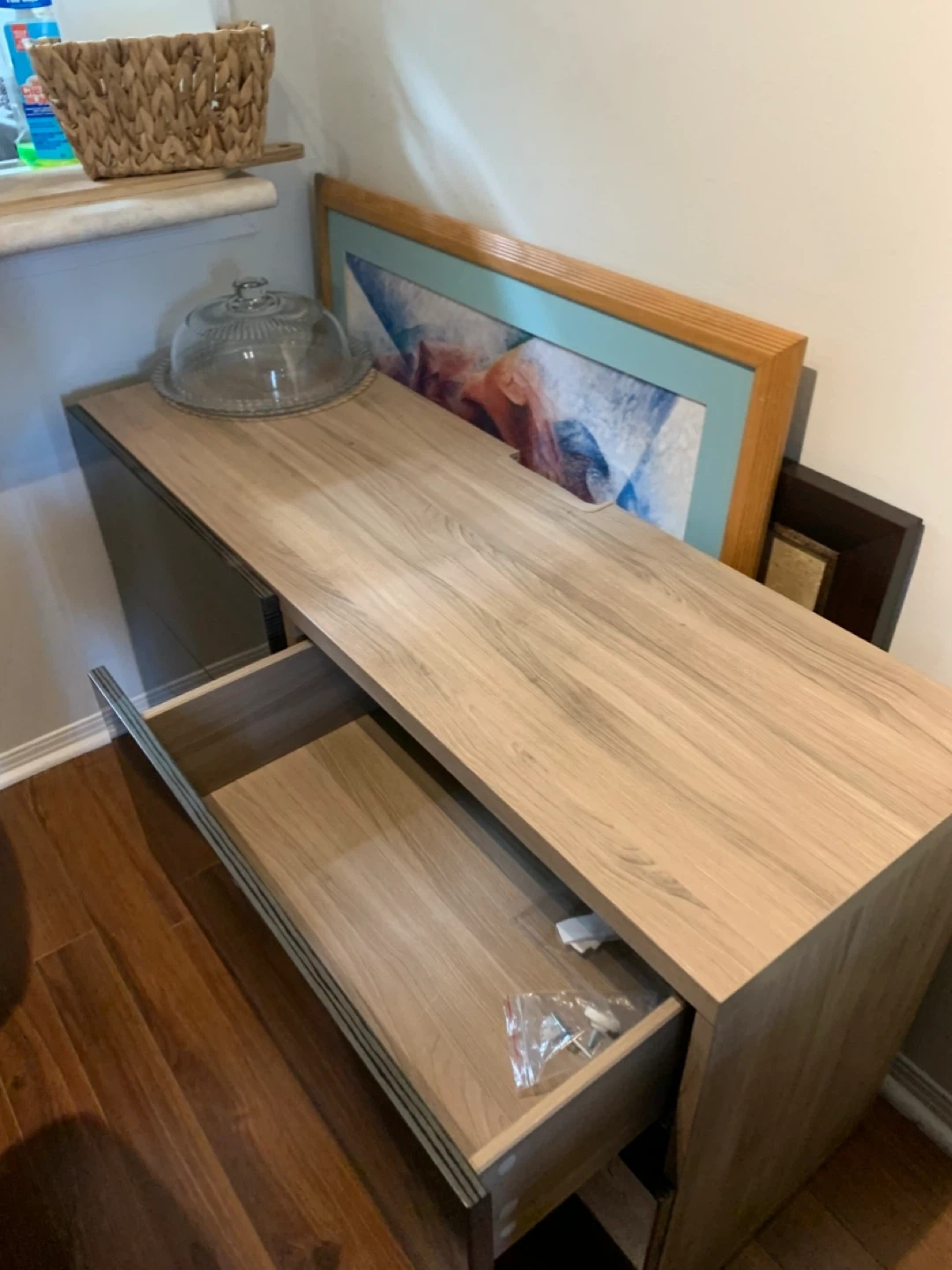 This modern dresser features a light wood-grain top with dark, sleek drawer fronts. It has three drawers for storage. It's a nice accent piece for any room.