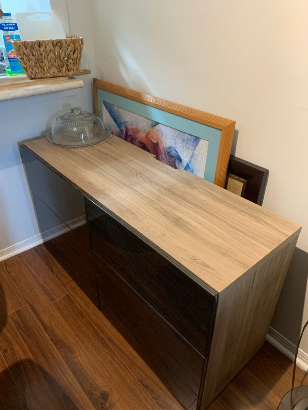 This modern dresser features a light wood-grain top with dark, sleek drawer fronts. It has three drawers for storage. It's a nice accent piece for any room.