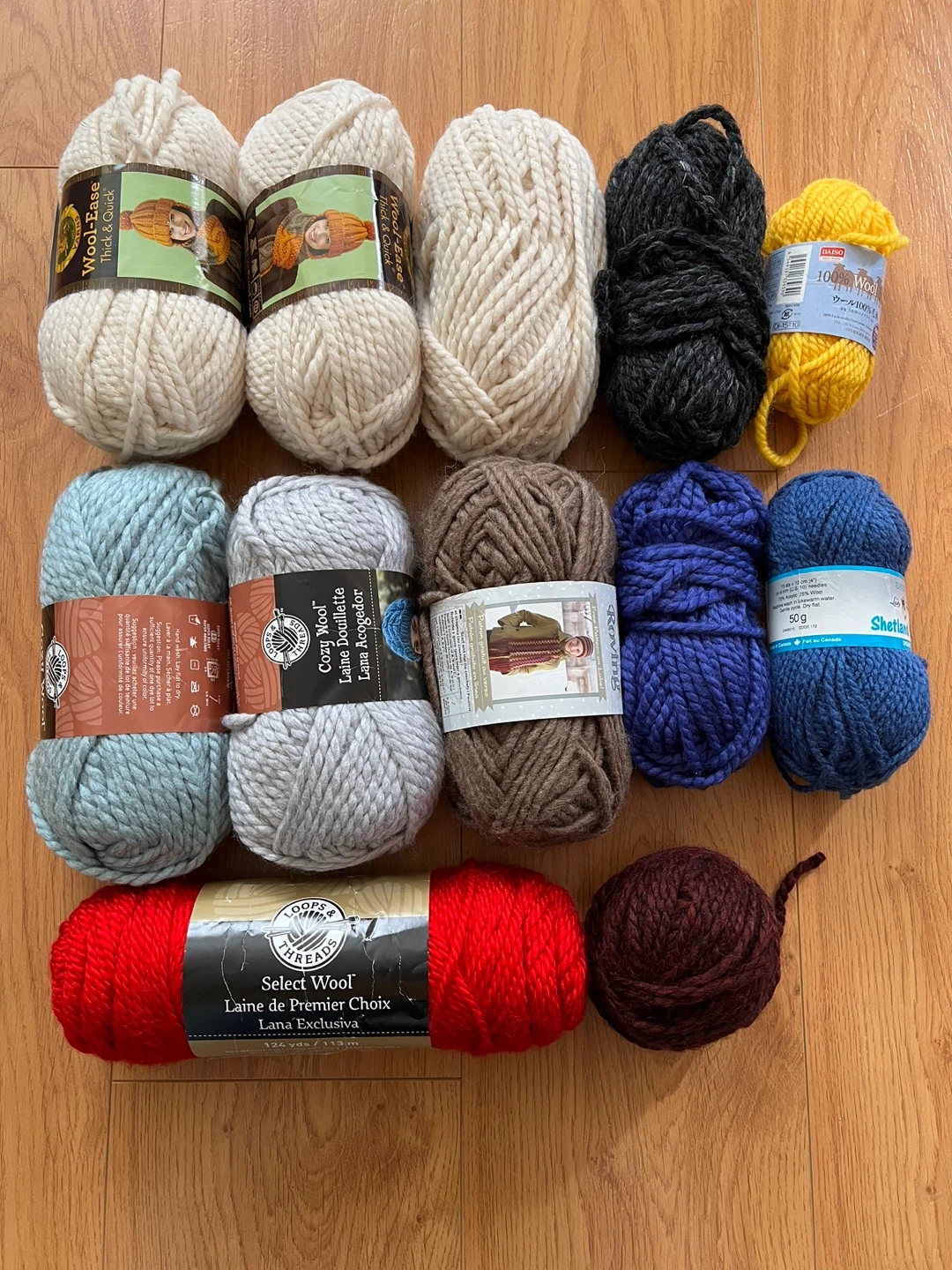 Selling a lot of yarn balls in various colours and brands, including Loops & Threads Select Wool, Wool-Ease Thick & Quick, and DAISO 100% Wool. Some are unused. Take all for only $40!