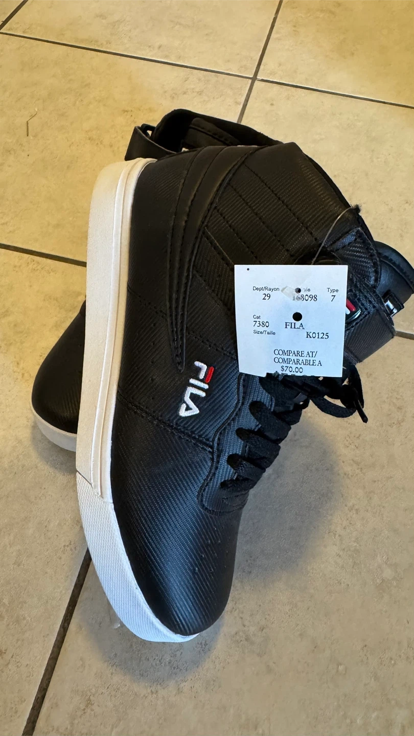 These Fila high-top sneakers , brand new and ready for a new adventure! They're black with a cool high-top design and feature the iconic Fila logo. Size 6