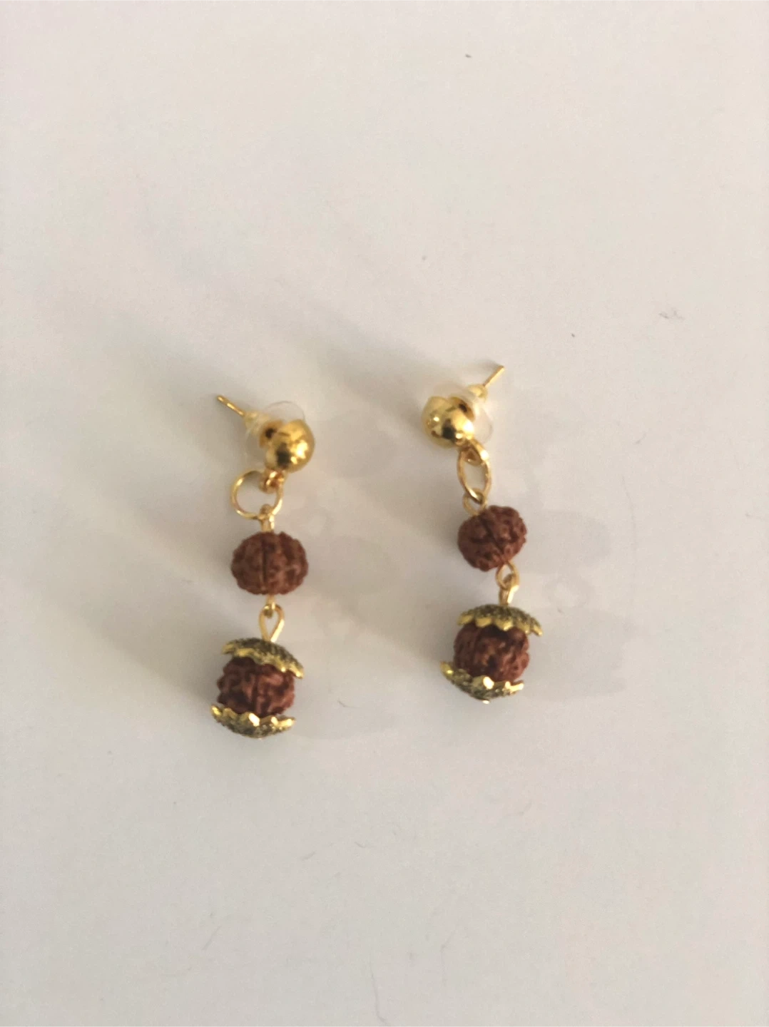Cute dangle earrings featuring rudraksha beads and gold-tone metal accents! They're in absolutely new in condition and ready to add a unique touch to your style.