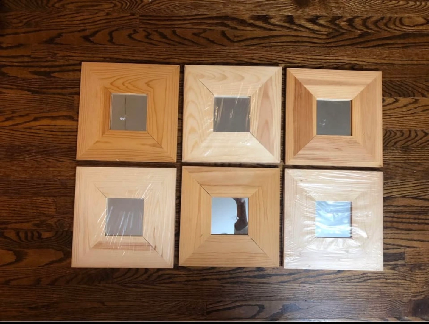 six Ikea square mirrors. Light coloured wood frames. Perfect for a gallery wall or bathroom. New in plastic wrap individually. $25 for all.