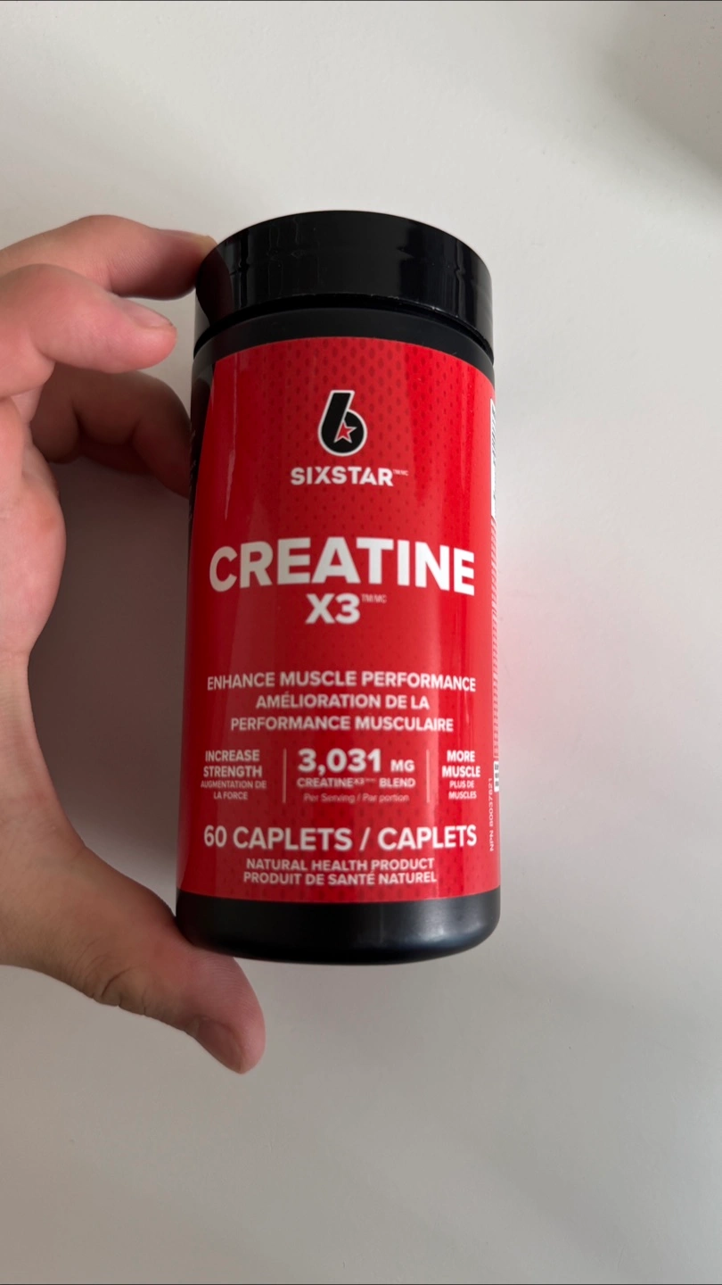 Selling a bottle of Six Star Creatine X3, which contains 60 caplets. It's designed to enhance muscle performance and increase strength. Each serving contains 3,031mg of creatine blend. A natural health product.
