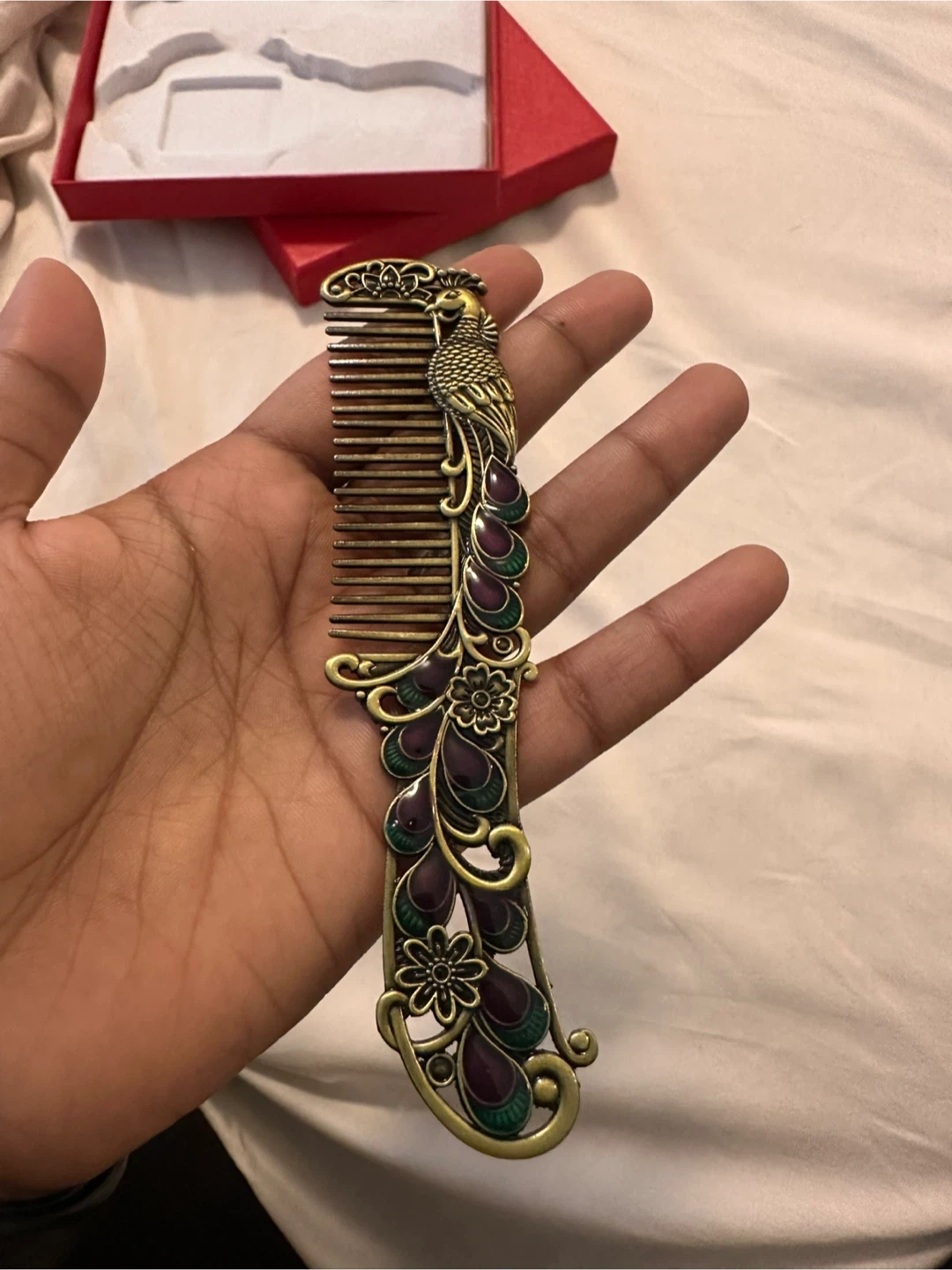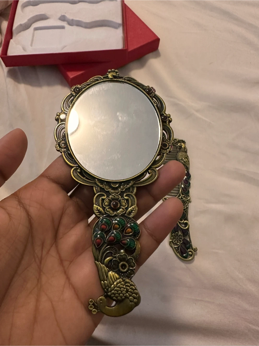 This is a vintage-inspired peacock mirror and comb set. It's crafted with intricate details and a beautiful antique bronze finish. The set includes a handheld mirror and a matching comb.