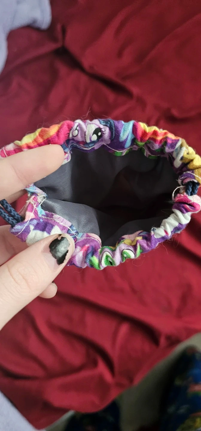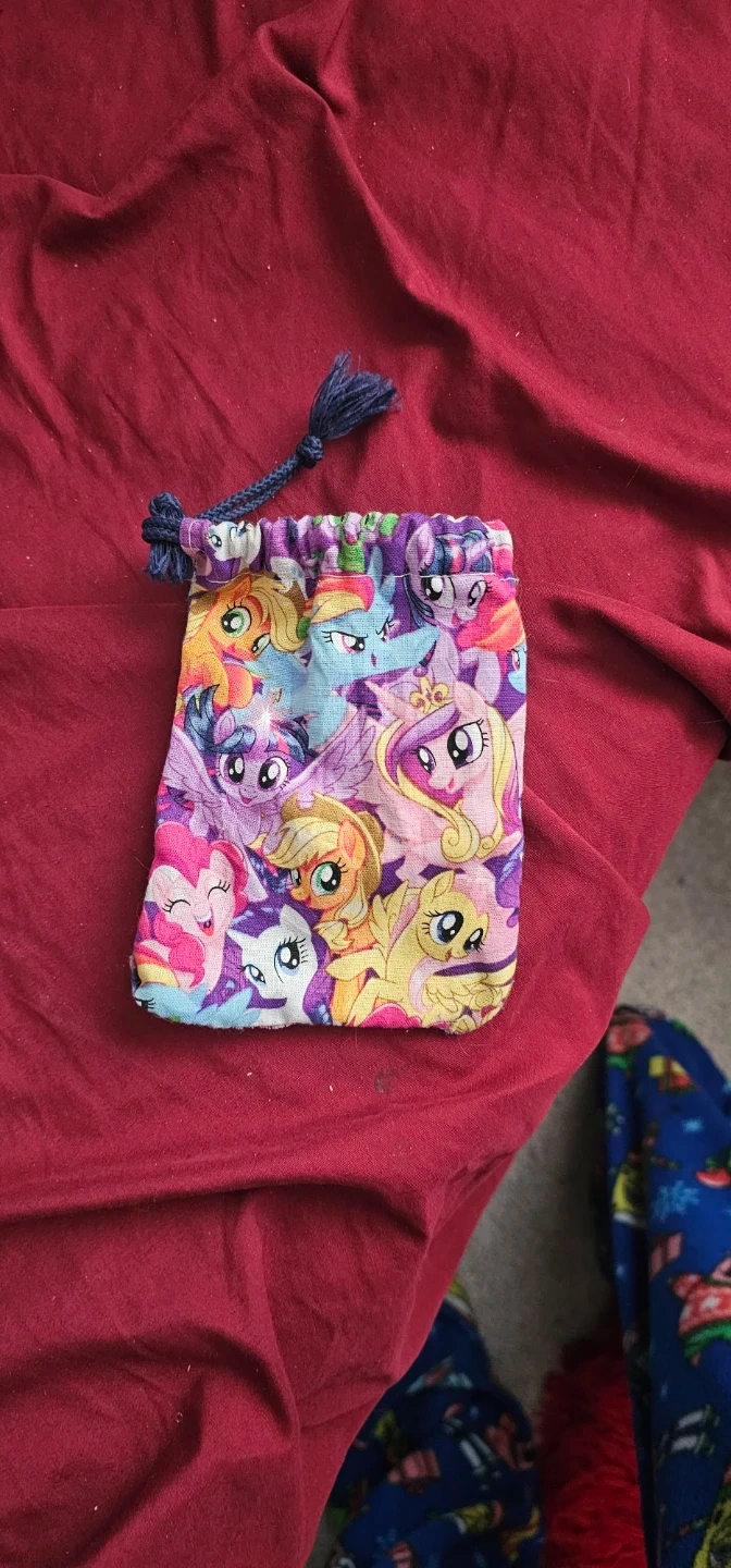 This fun drawstring pouch features colourful characters from My Little Pony. It's a small, fabric bag with a cinched opening and braided cord closure. Perfect for small trinkets or collecting.