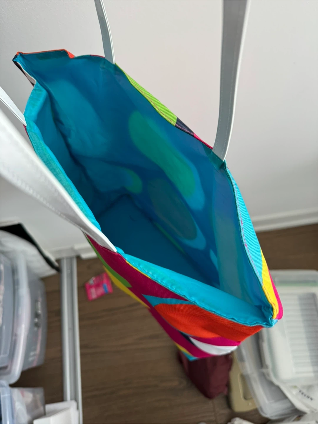 Bright and colourful tote bag with a geometric circle pattern. It features a vibrant pink exterior with a contrasting blue interior lining. This bag is perfect for everyday use, carrying groceries or as a beach tote!