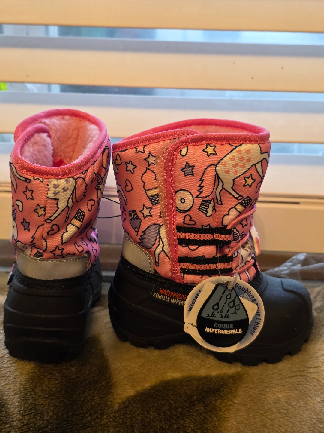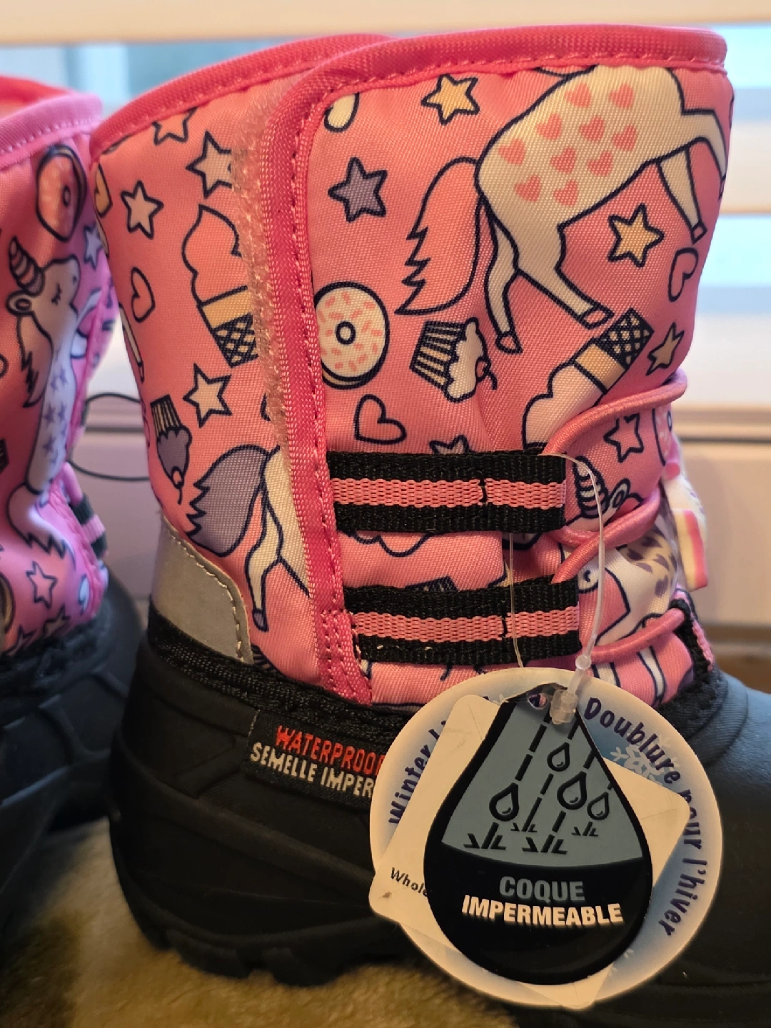 These adorable pink winter boots are in excellent condition and ready for some snowy adventures! They feature a fun unicorn and sweets pattern and are waterproof to keep little feet dry. Size 4.