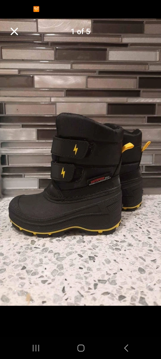 20Keep your little one's feet warm and dry this winter with these black and yellow winter boots! They are waterproof and made with synthetic materials. Size 4, perfect for those snowy days!