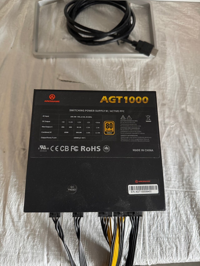 Aresgame 1000W 80+ Gold PSU (AGT1000, missing/mismatched cables, untested) — $25