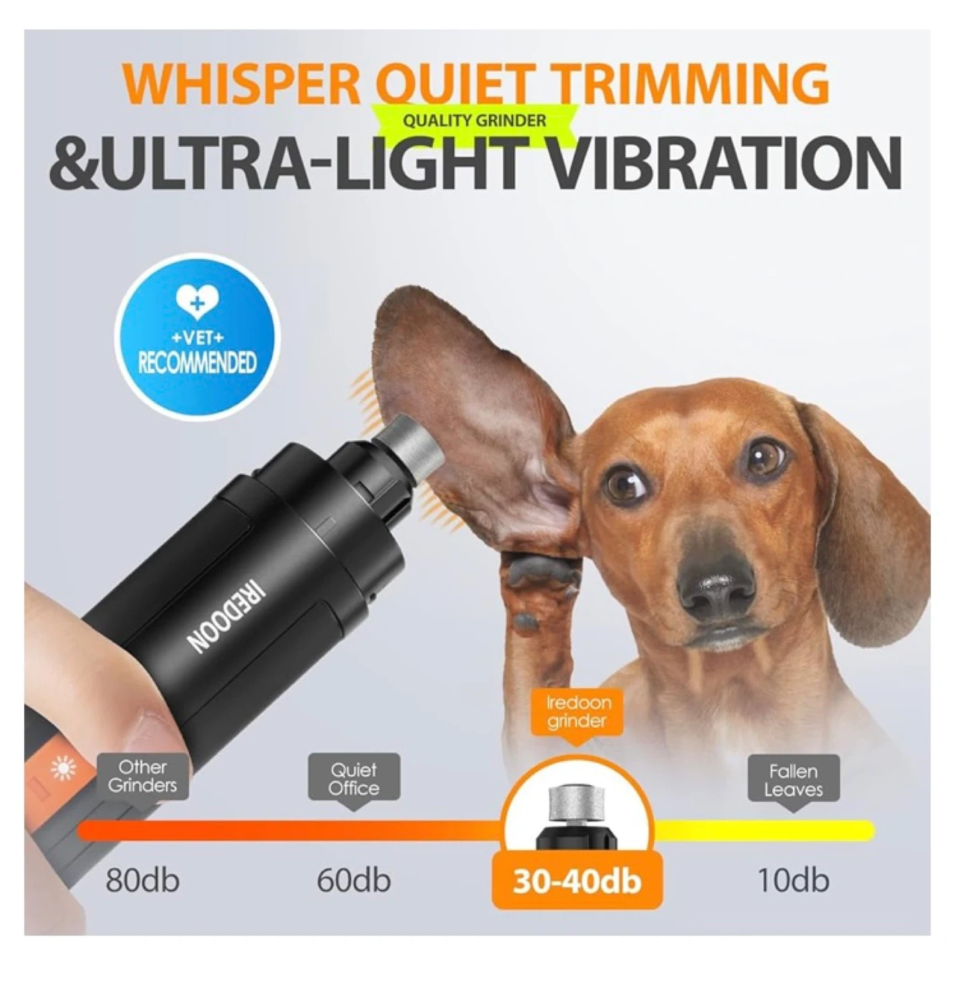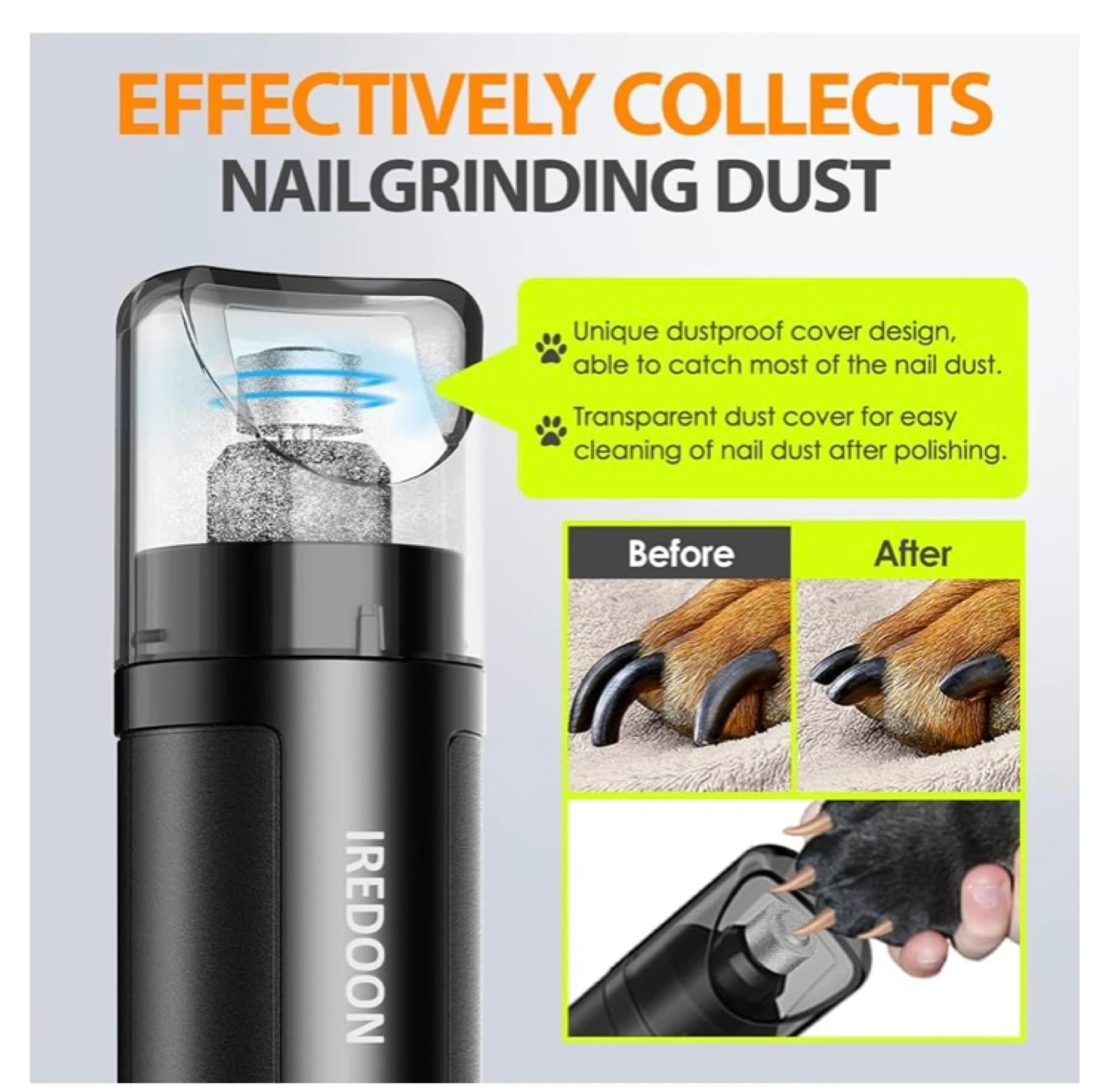 This Iredoon pet nail grinder is designed for quiet trimming with ultra-light vibration. It features wireless use and fast USB-C charging, offering up to 12 hours of working time. The grinder includes a unique dustproof cover that effectively collects nail grinding dust.