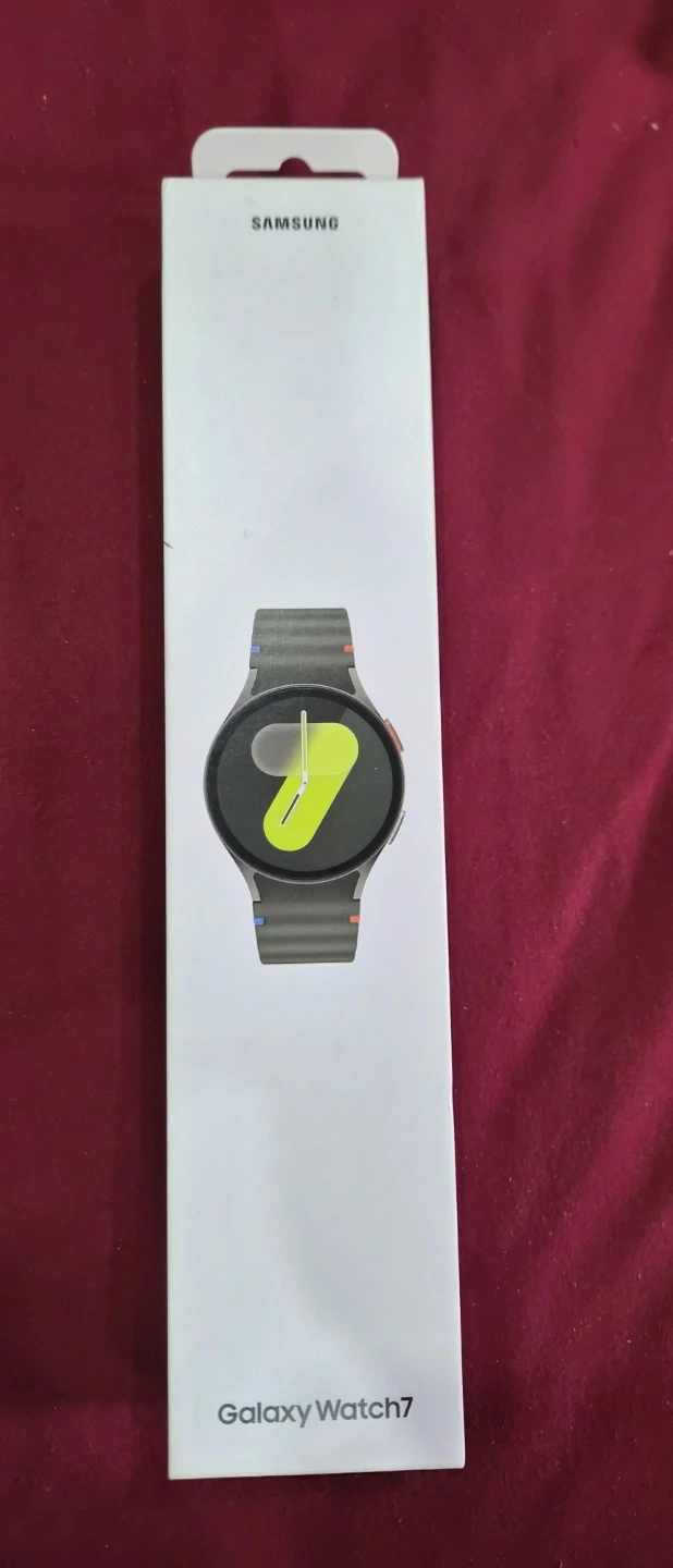This is a Samsung Galaxy Watch 7 smartwatch in its original packaging. It's a tech accessory for everyday use. This watch tracks fitness and notifications.