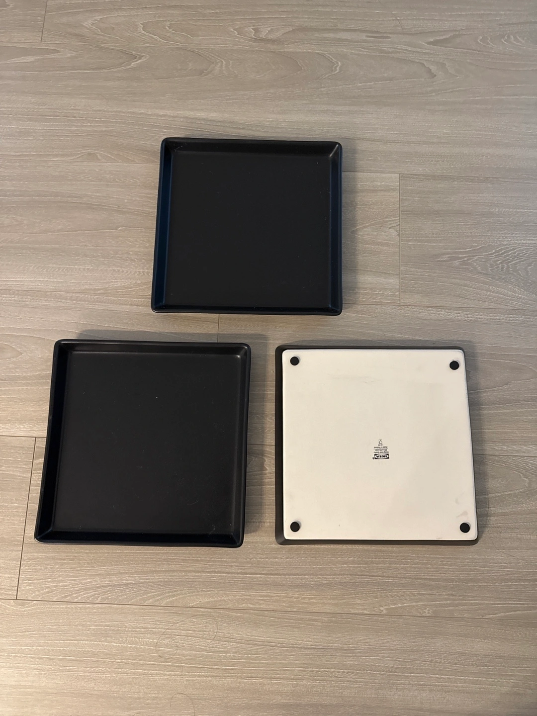 Selling a set of 3 square plates from Ikea! They're in great shape and perfect for serving up snacks or desserts. The plates are black, adding a modern touch to any table setting. These are super handy to have around the house