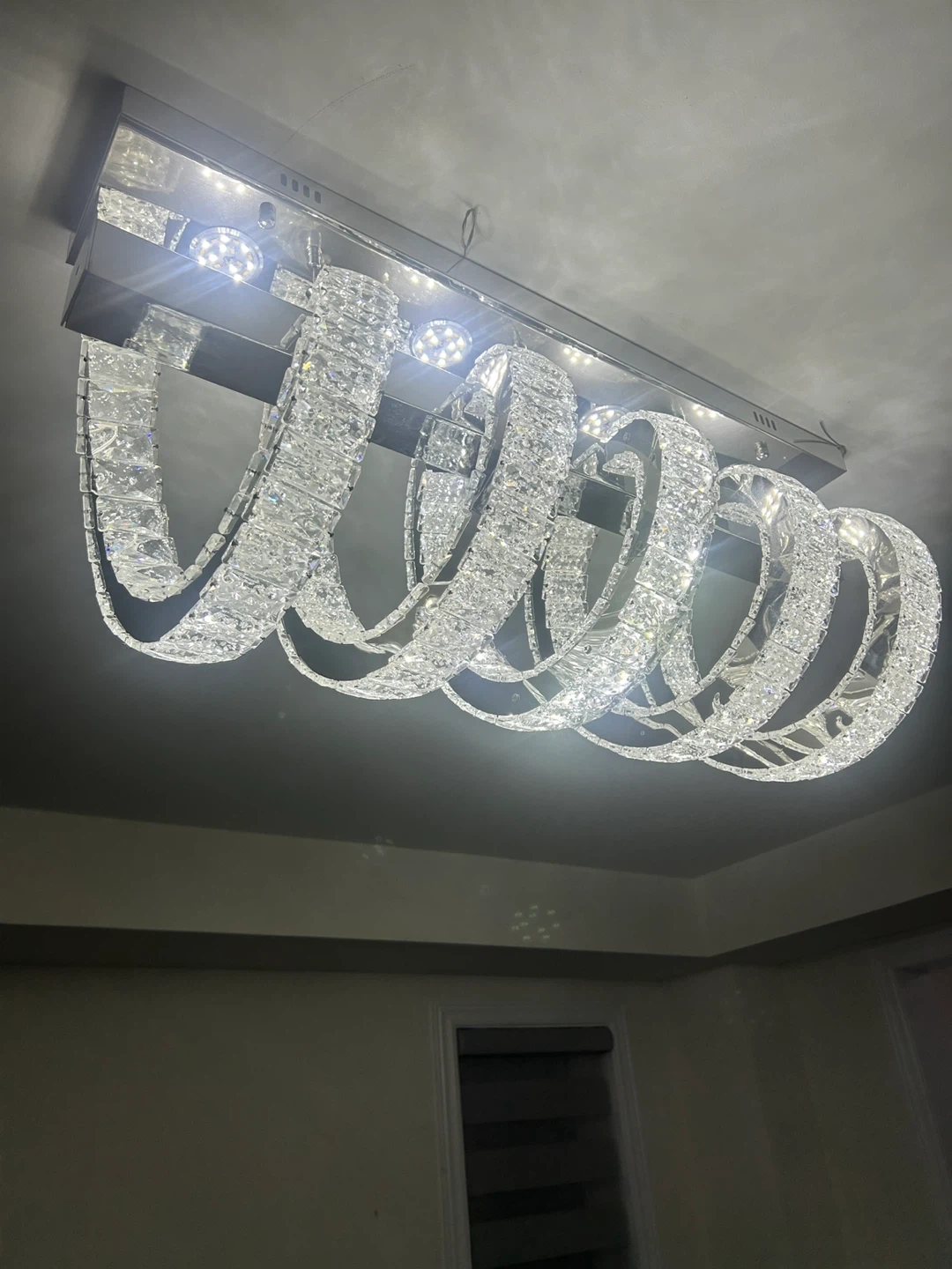 A striking modern chandelier featuring multiple crystal-encrusted spiral rings suspended from a rectangular chrome base. It has a sleek, contemporary design that adds a touch of glamour. Perfect for illuminating a dining room or living space!