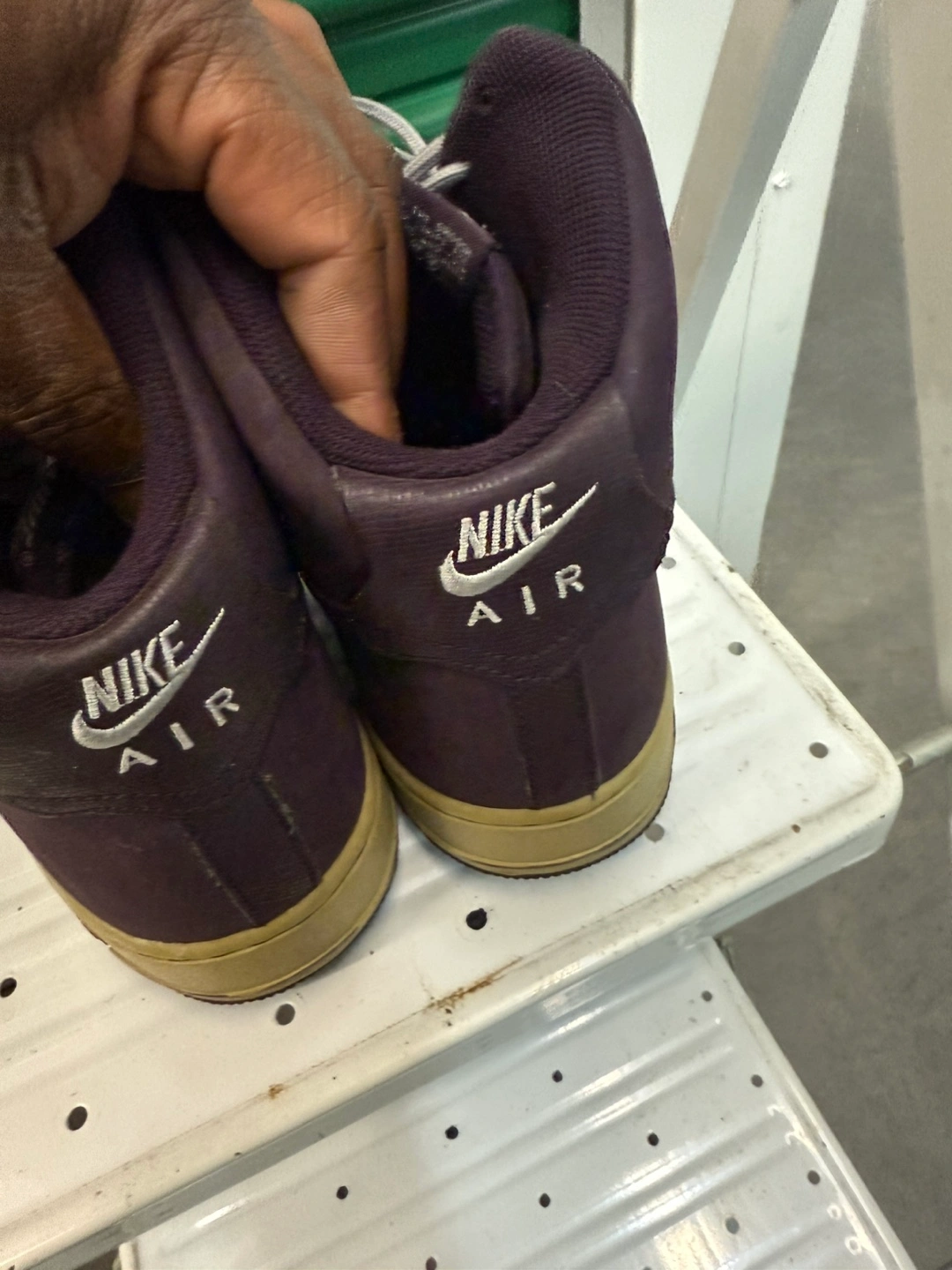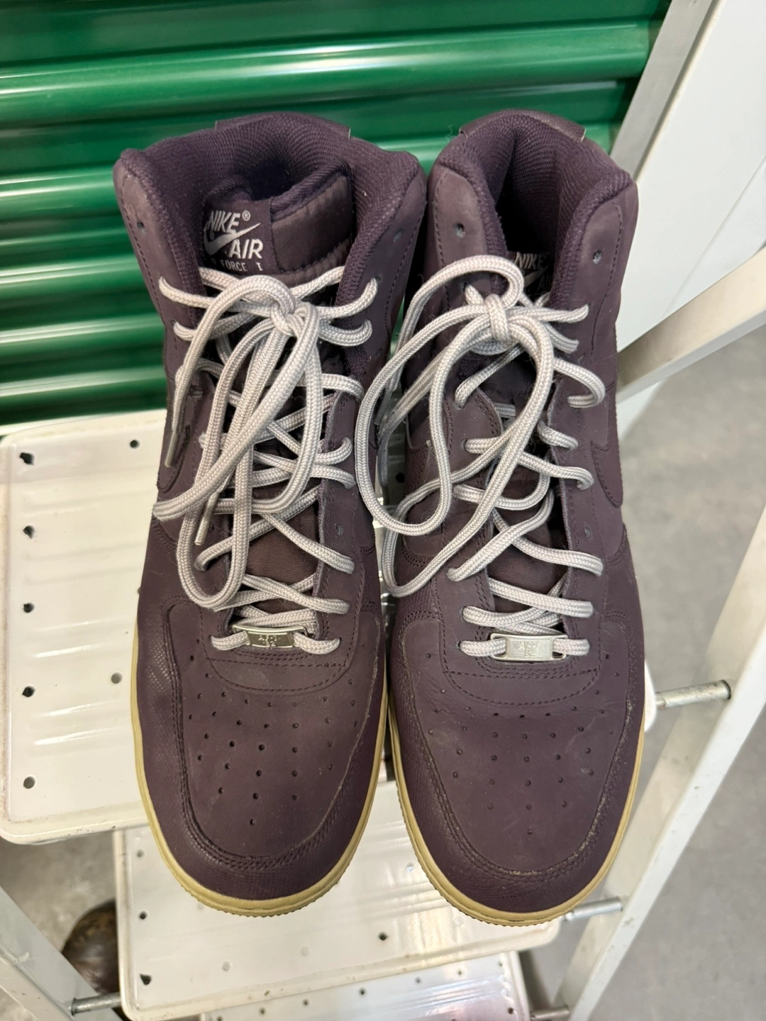 Selling a pair of Nike Air Force 1 high top sneakers. They are a stylish dark purple color with a tan sole. These shoes are in used condition, so please check the photos for signs of wear