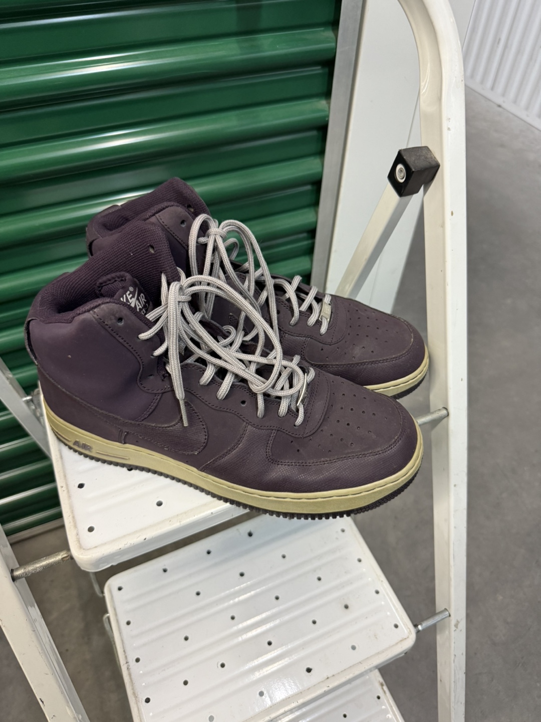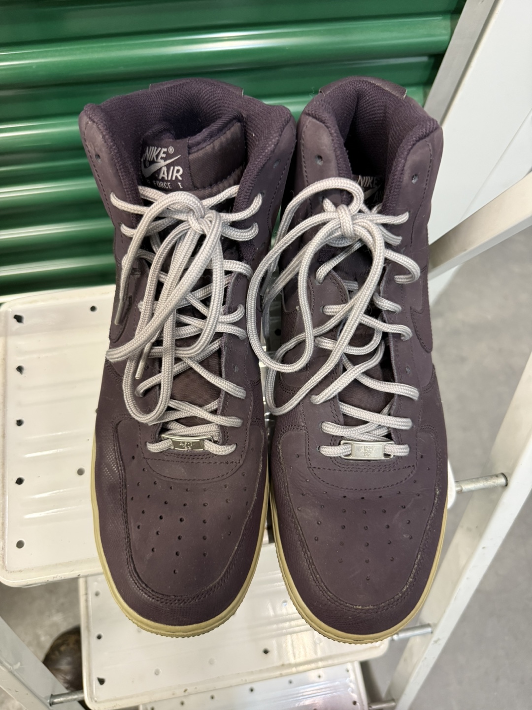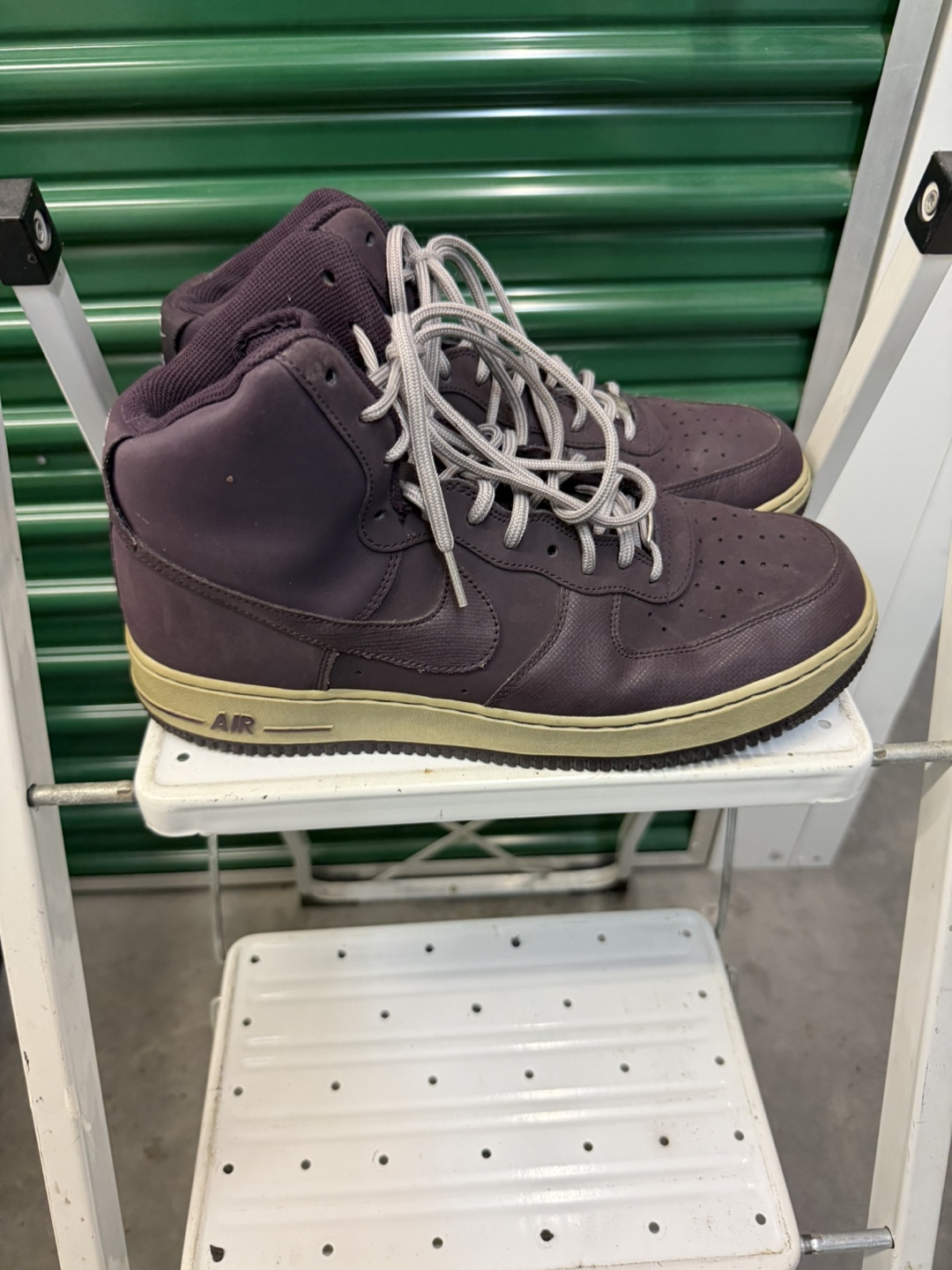 Selling a pair of Nike Air Force 1 high top sneakers. They are a stylish dark purple color with a tan sole. These shoes are in used condition, so please check the photos for signs of wear