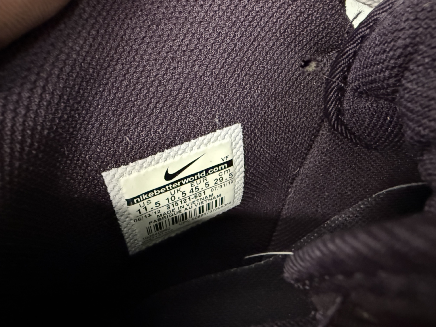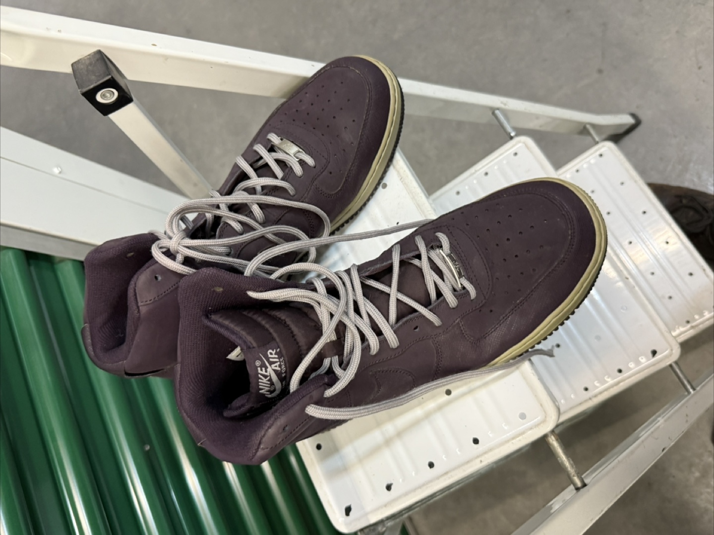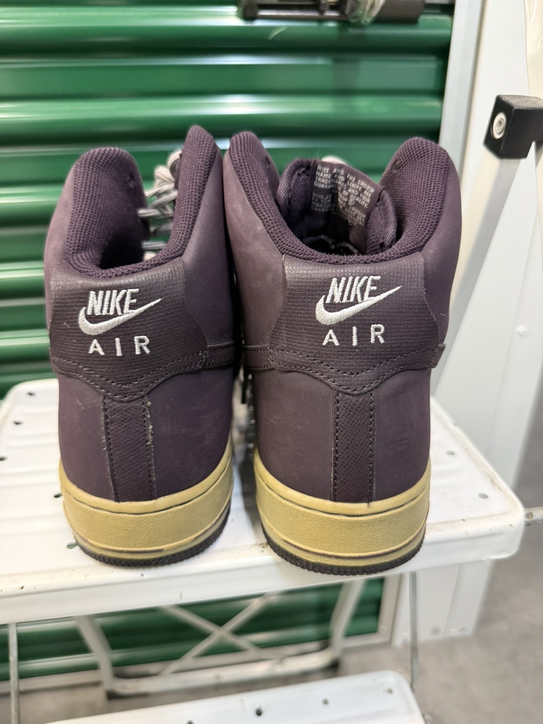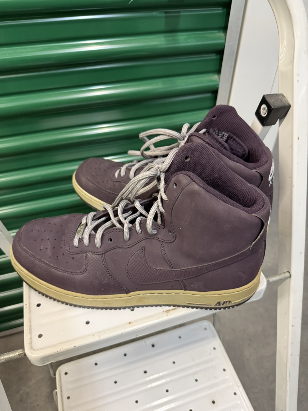 Selling a pair of Nike Air Force 1 high top sneakers. They are a stylish dark purple color with a tan sole. These shoes are in used condition, so please check the photos for signs of wear