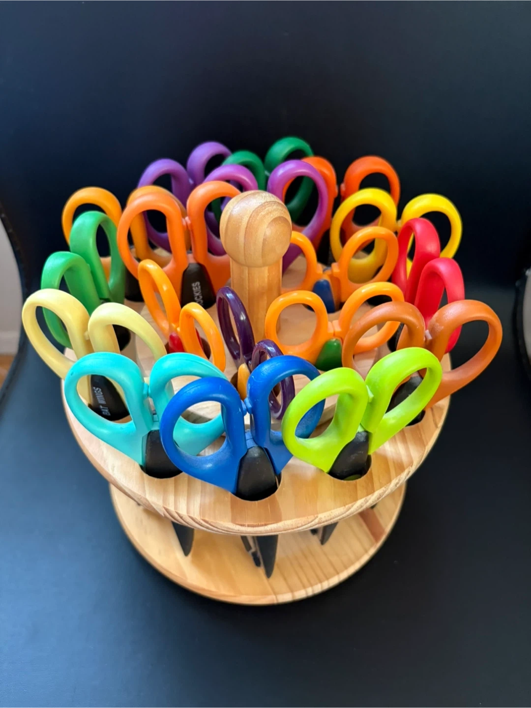This set includes multiple pairs of colourful kids scissors, perfect for school projects or arts and crafts. They're designed with safety in mind for little hands. The rotating wooden stand keeps them organized and easily accessible.