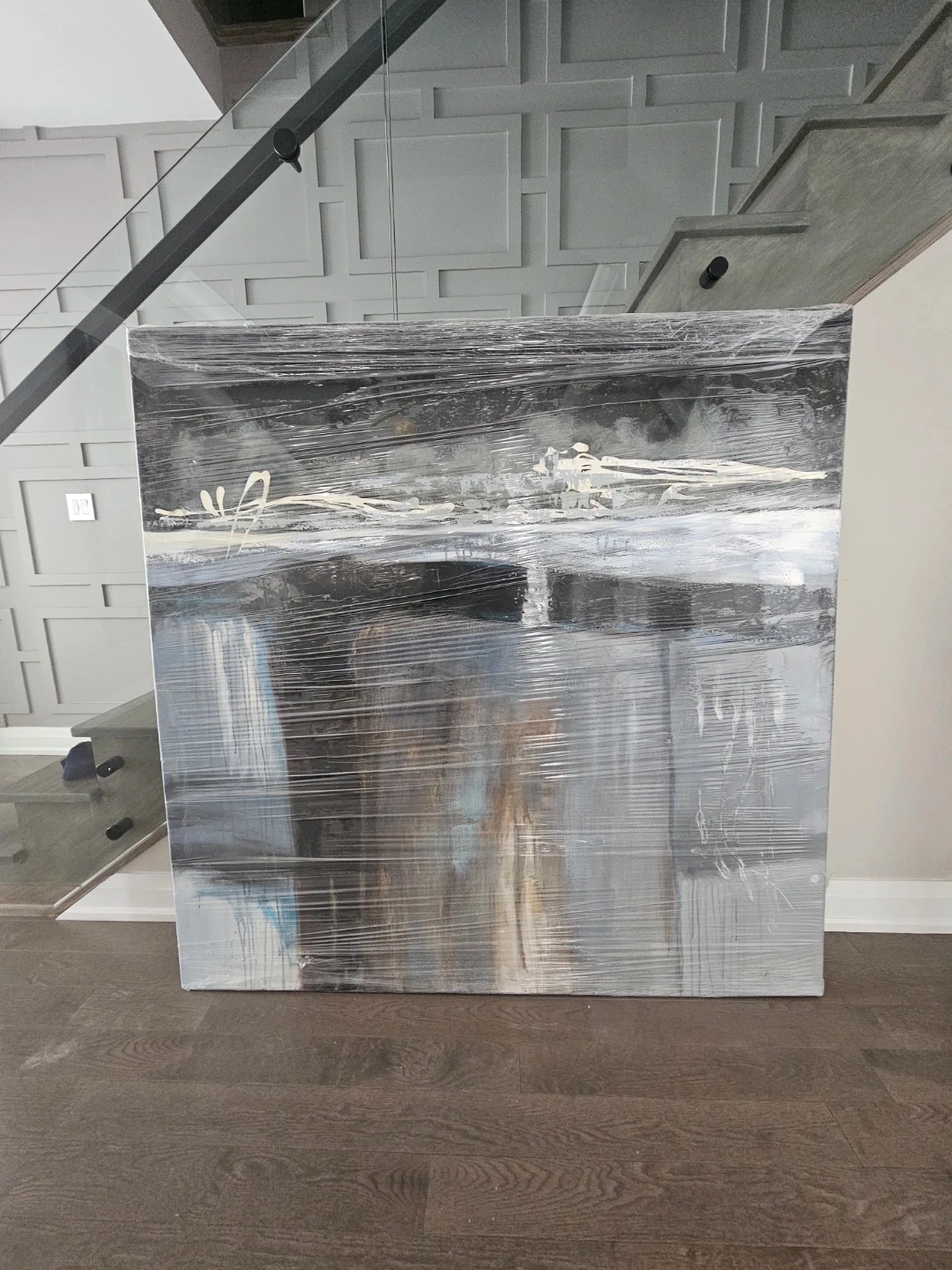 Abstract canvas painting with dark and light grey tones. The art piece is wrapped in protective plastic. It's a contemporary style painting for home decor.
