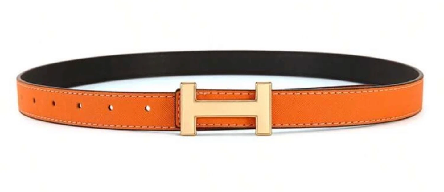 This stylish belt features a vibrant orange leather strap with a classic gold-tone H buckle. It's designed with meticulous stitching for a refined look. The reversible design offers versatility with a dark interior.