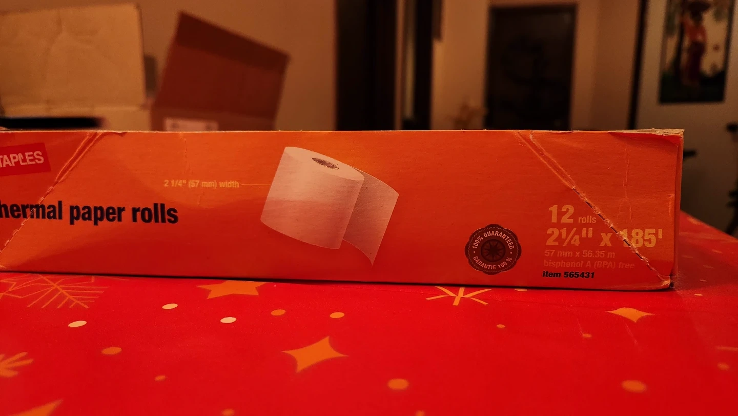 Selling a box of Staples thermal paper rolls. The box includes 12 rolls, each 2 1/4" x 185'. Great for your business needs!