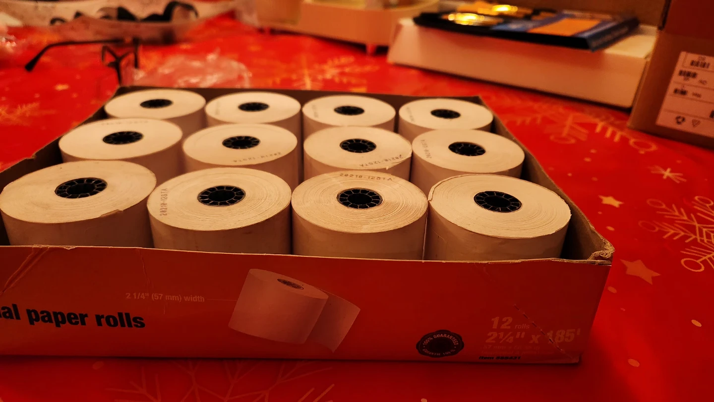 Selling a box of Staples thermal paper rolls. The box includes 12 rolls, each 2 1/4" x 185'. Great for your business needs!