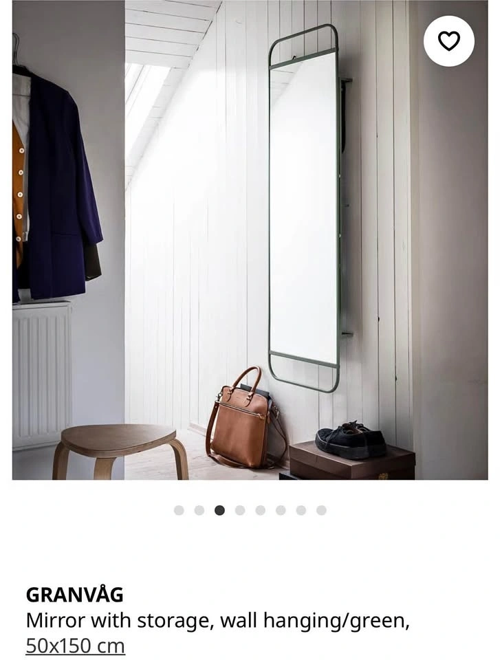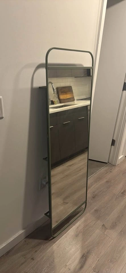 IKEA GRANVÅG wall mirror with hidden storage. Minimal, modern design – perfect for entryway or bedroom. Brand: IKEA. Model: GRANVÅG. Size: 50 x 150 cm. Color: Green. Condition: Very good. Wall hanging. Pickup: Jersey City. Payment: Cash or Zelle. Selling due to moving. Available ASAP.