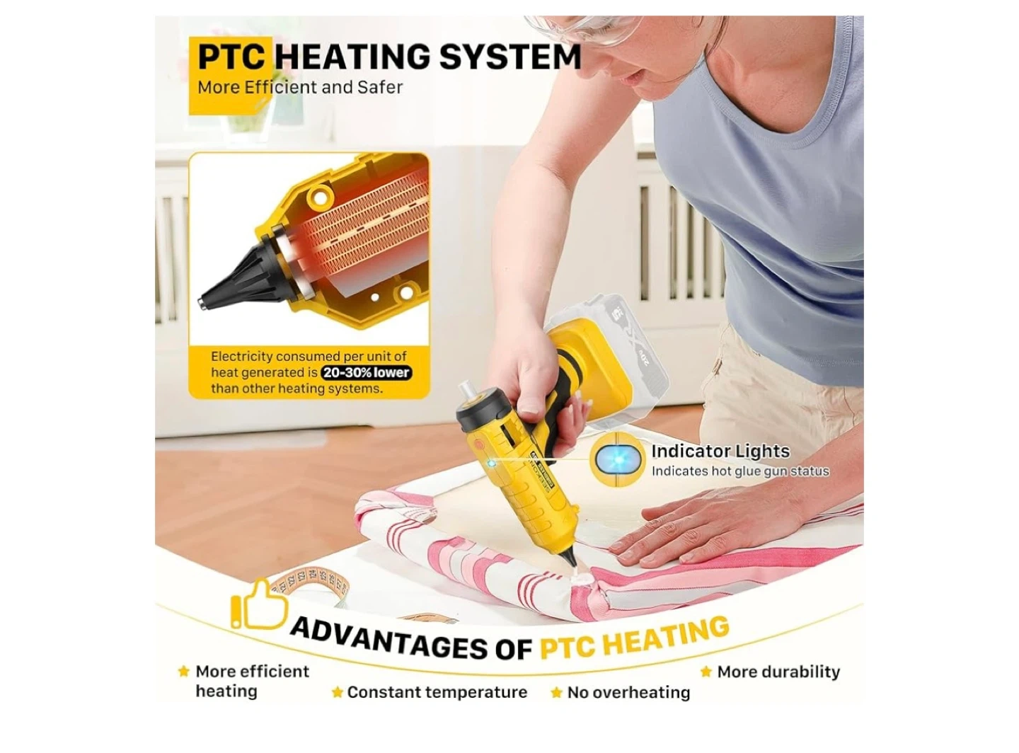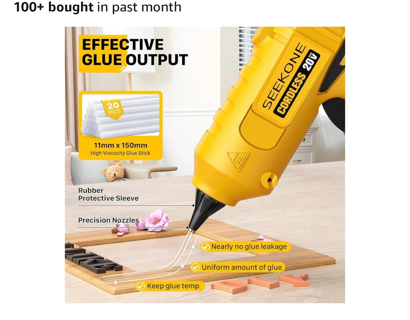 This is a Seekone 20V cordless hot glue gun. It features a PTC heating system for efficient and safe use. The gun offers precise nozzles for minimal glue leakage and uniform output. It includes 20 pcs of 11mm x 150mm high viscosity glue sticks.