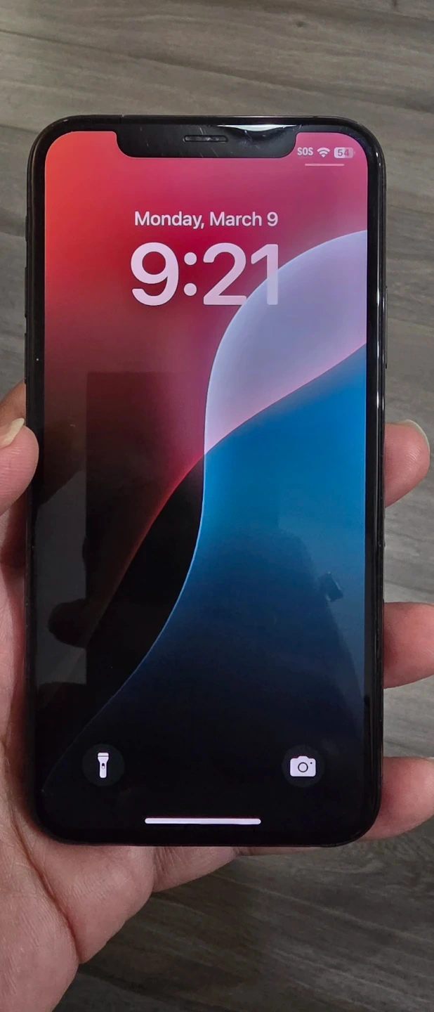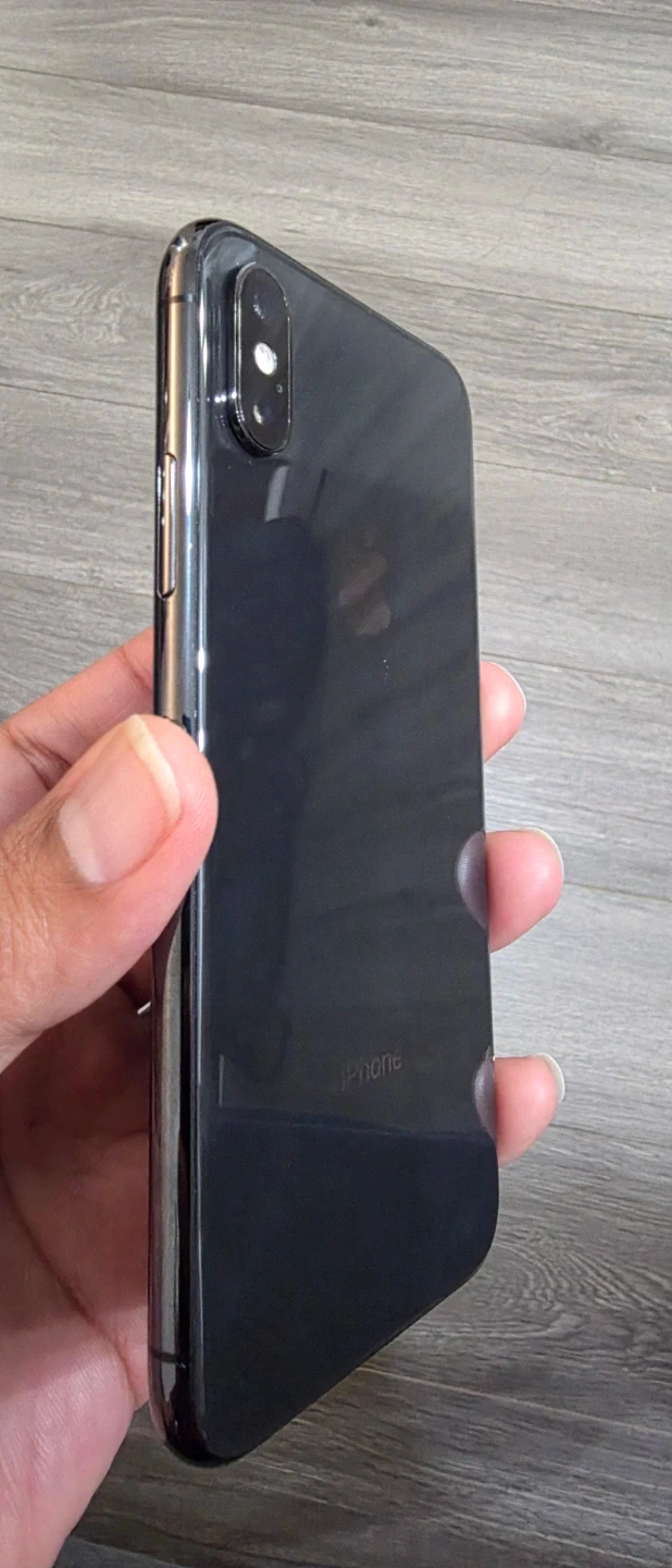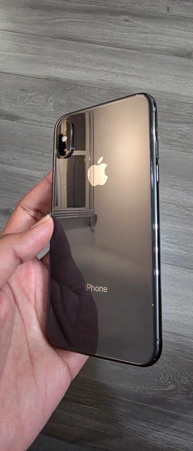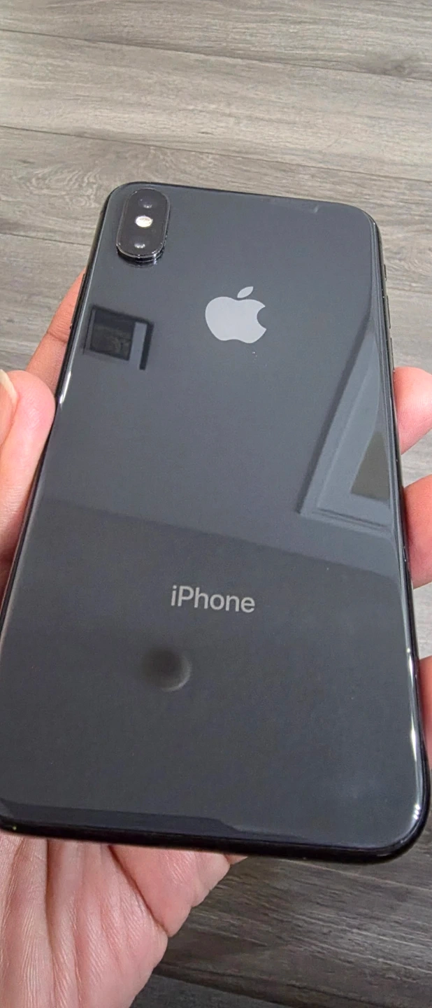 An Apple iPhone XS smartphone. It's a dark grey model. It has a dual-camera system on the back. This phone is great for everyday communication and taking photos!