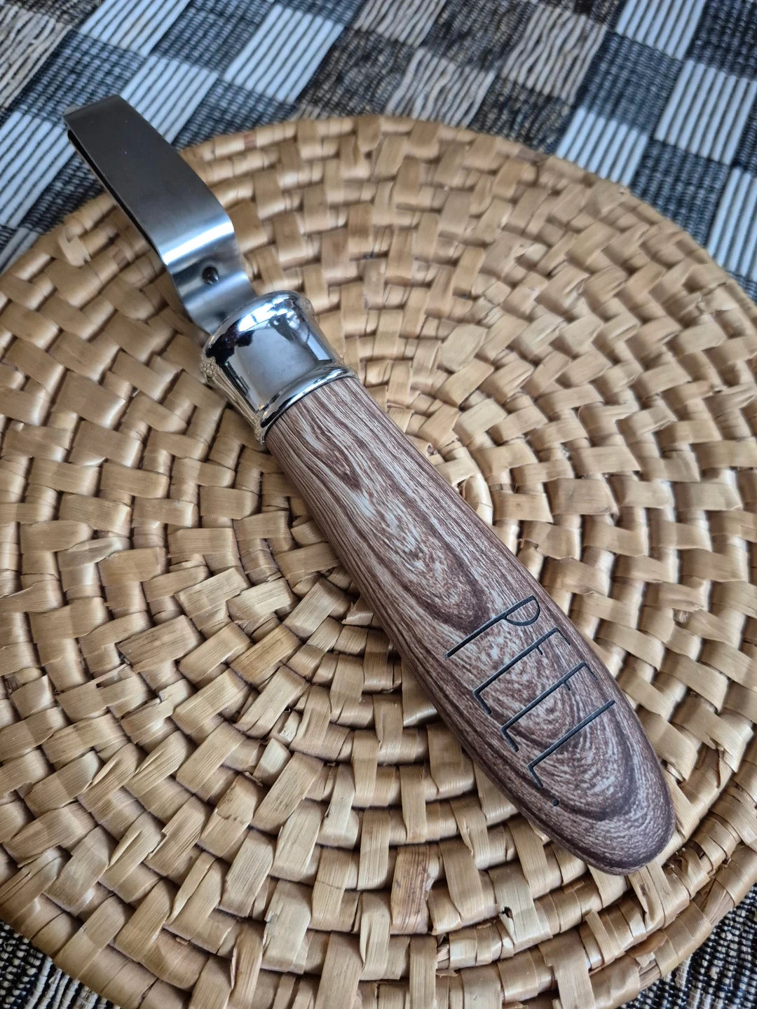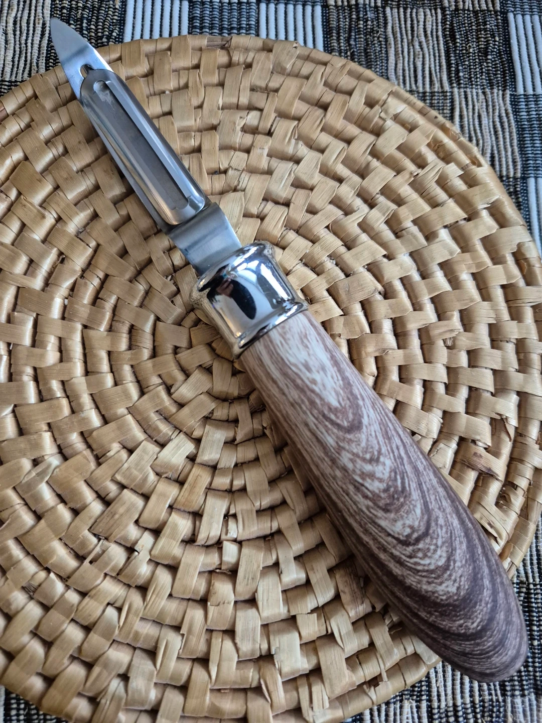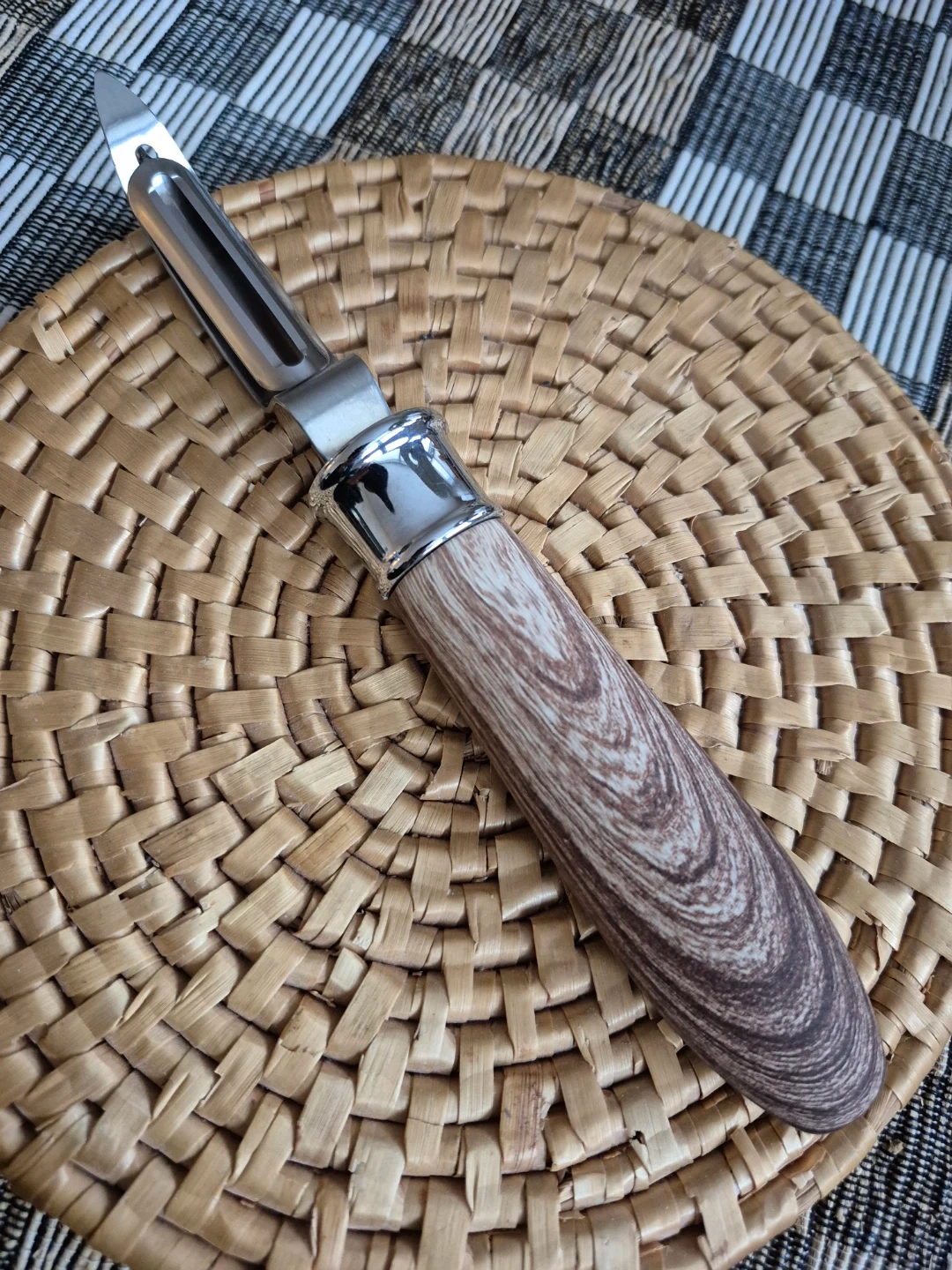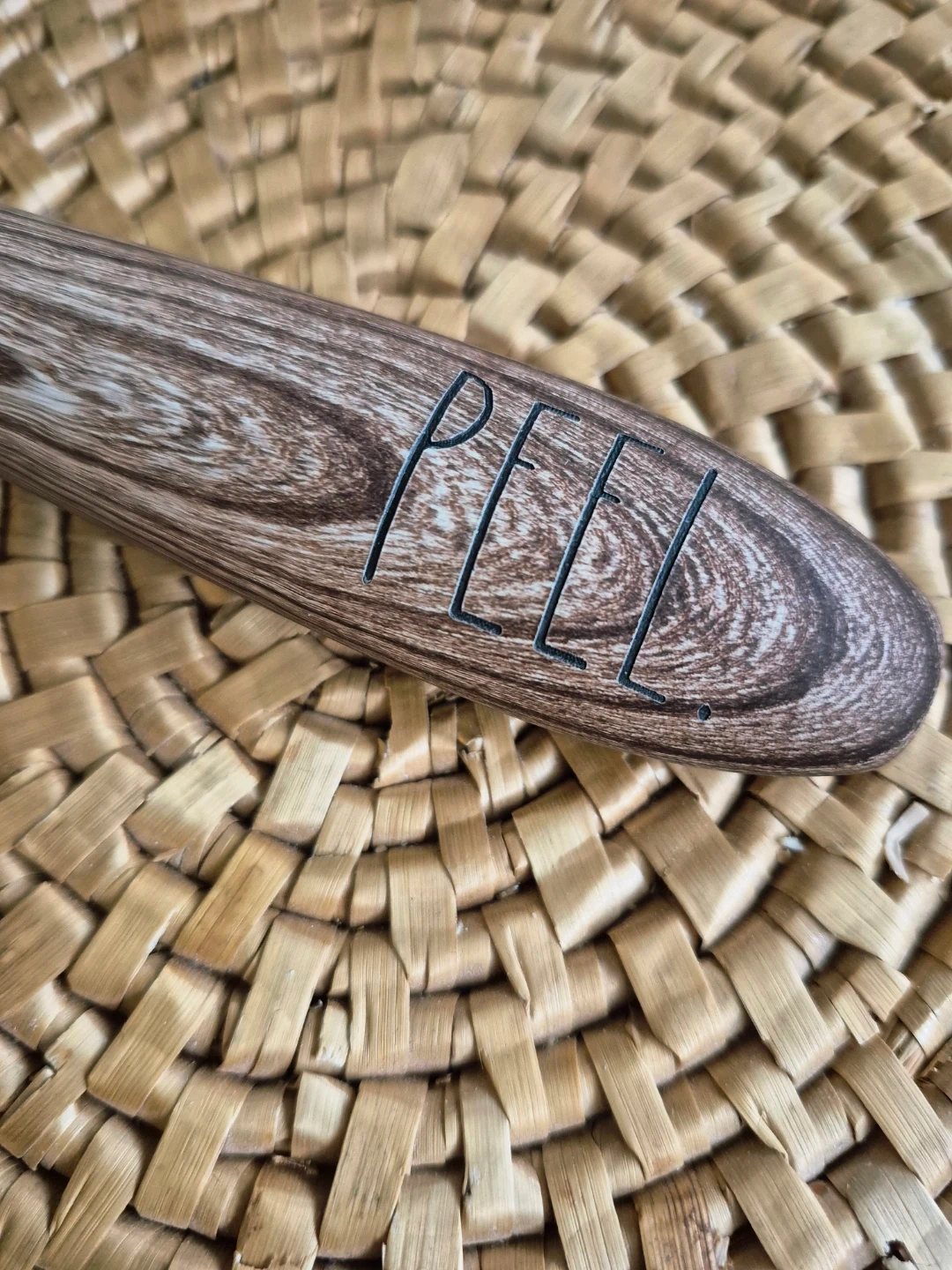 High quality comfort grip peeler with a chubby handle in a soft material that's easy and pleasant to grip. It's made to look like wood (but feels softer) and says "PEEL" on it.