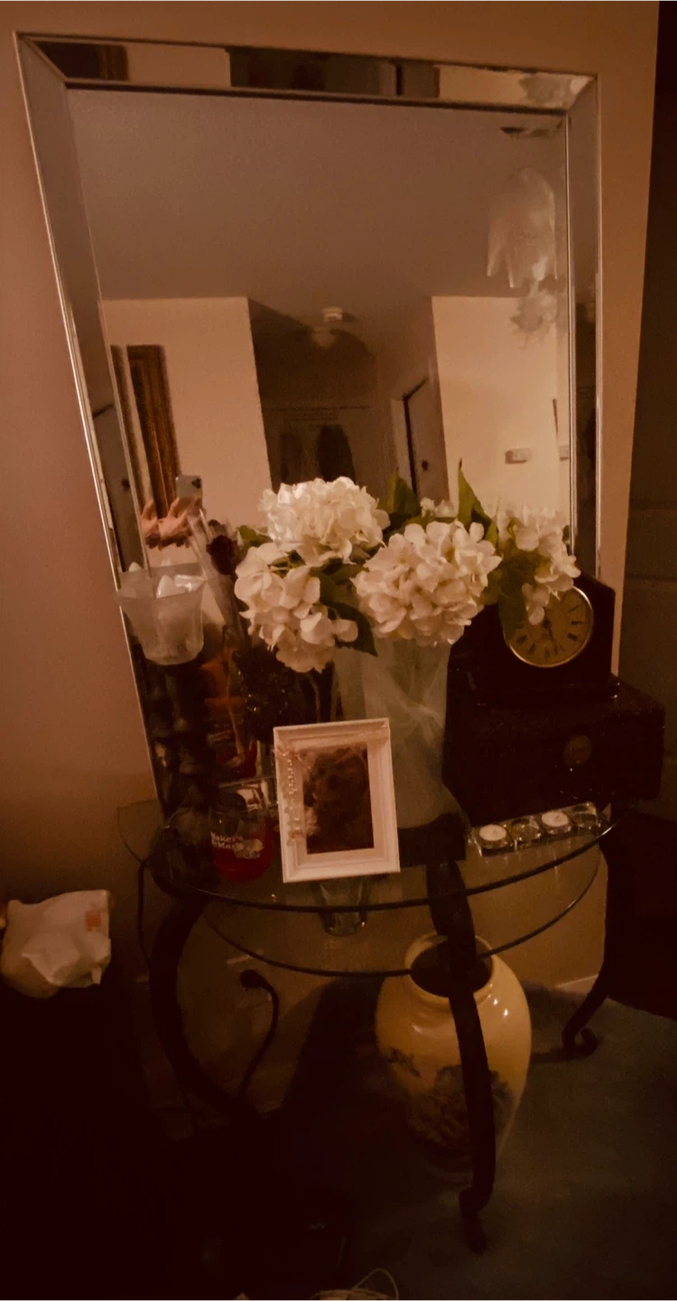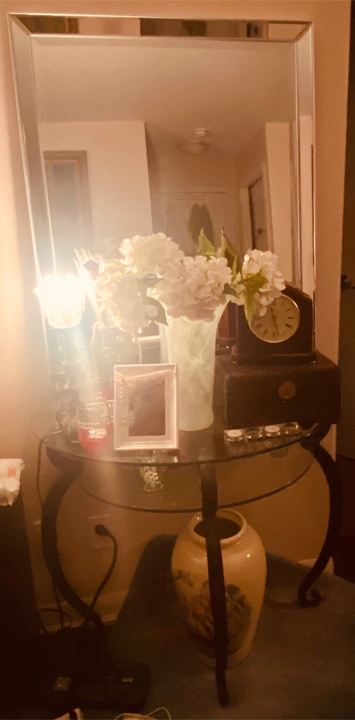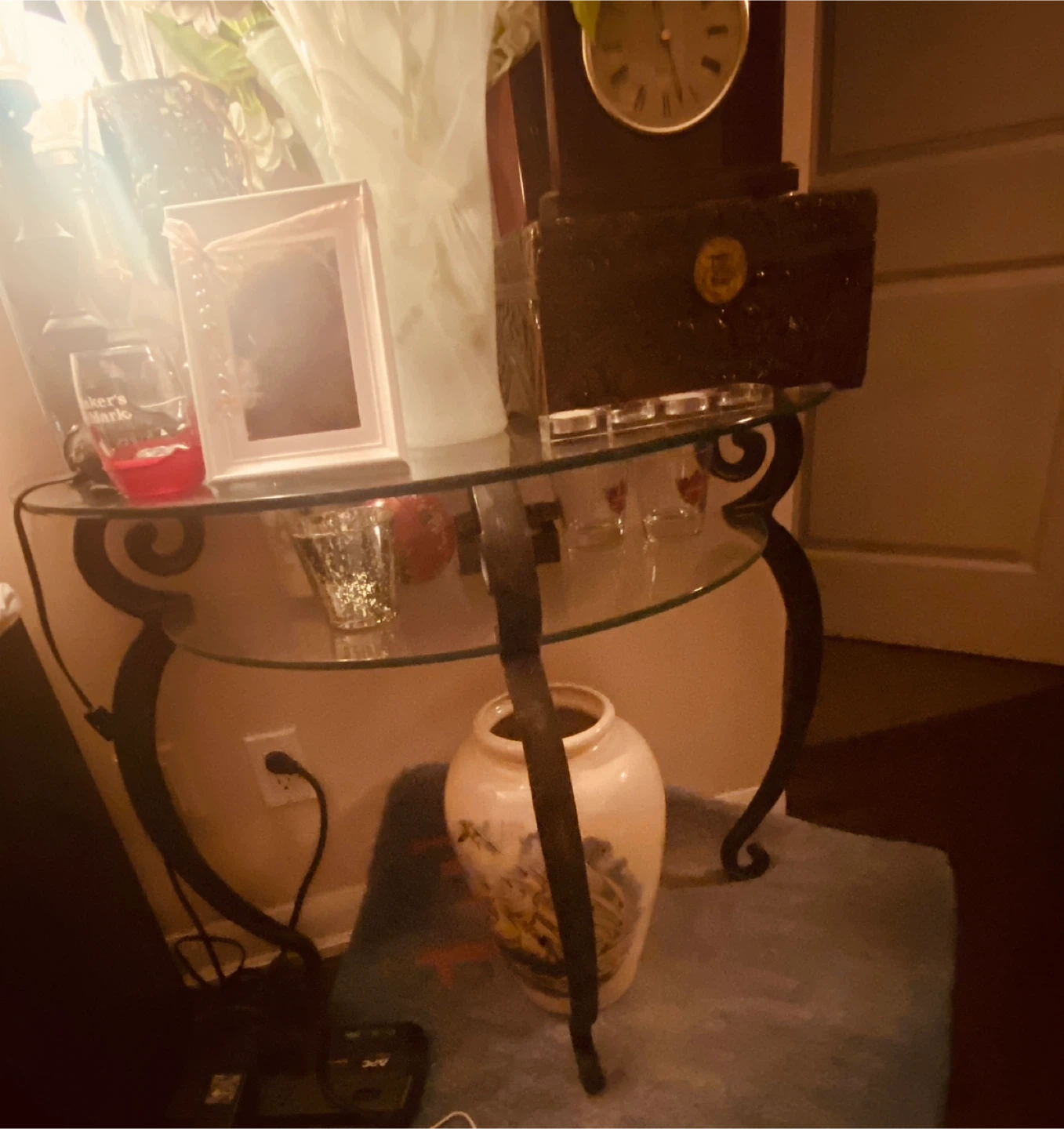A stylish console table featuring a clear glass top and an ornate, dark metal base with curved legs. It's perfect for entryways or living spaces. The table is approximately 30 inches tall with a curved top surface.