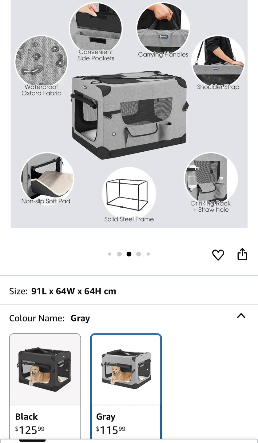 This Veehoo pet carrier is a soft-sided crate for pets. It's made with waterproof Oxford fabric and has a solid steel frame for durability. The carrier includes convenient side pockets, carrying handles, and a shoulder strap for easy transport. It also comes with a non-slip soft pad and a drinking rack with a straw hole. This carrier would be useful for taking your pet on travels or to the vet.