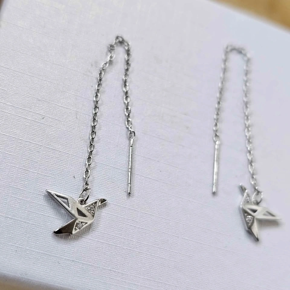 Delicate sterling silver paper crane origami threader earrings, brand new in box.