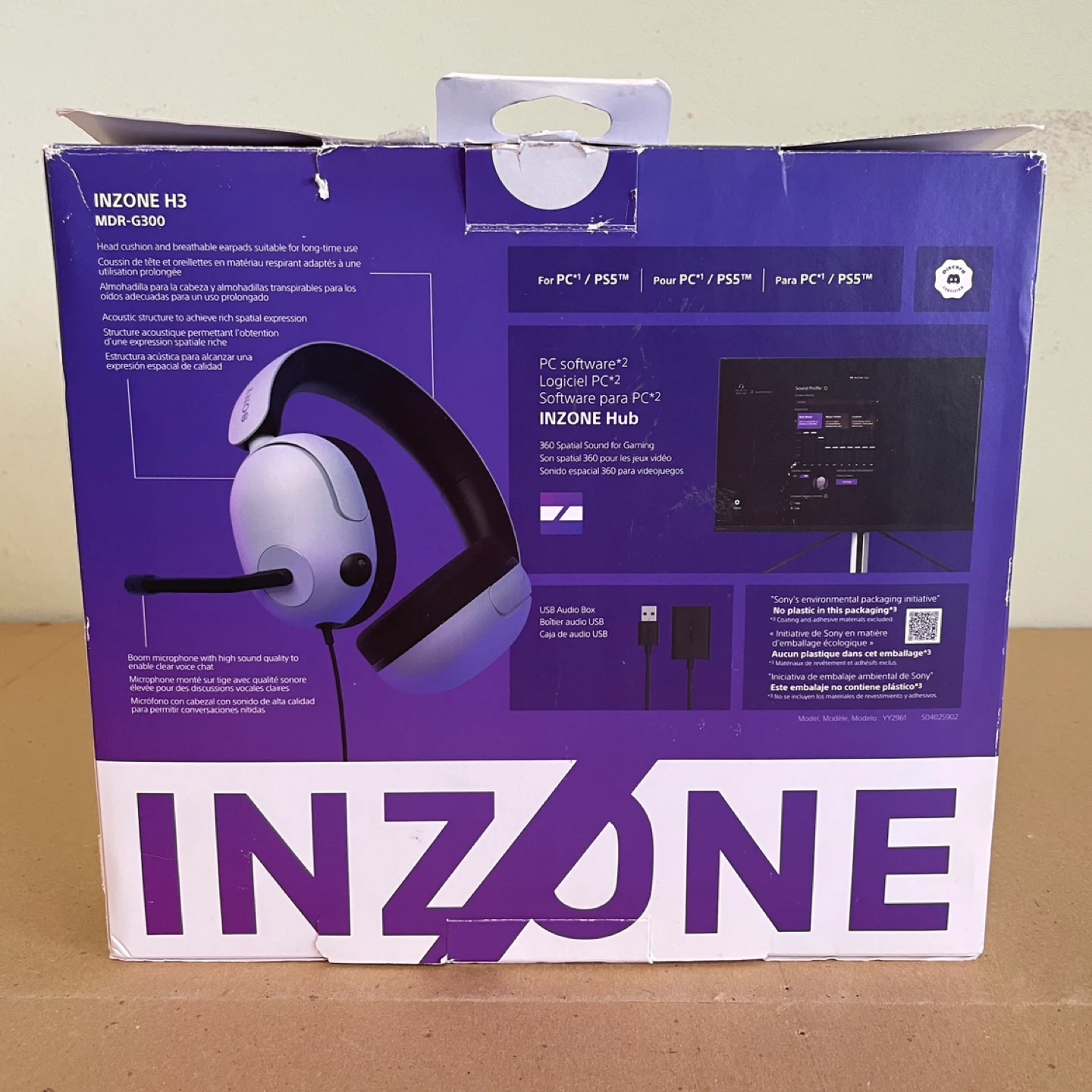 This Sony INZONE H3 wired gaming headset (model MDR-G300) is brand new open box. Compatible with PS4, PS5, PC and features a 360 Spatial Sound with a high quality flip down mic. It connects directly to the console via the 3.5mm audio jack on the controller, allowing for sound and microphone functionality. It also includes a separate aux to usb cable for pc use.