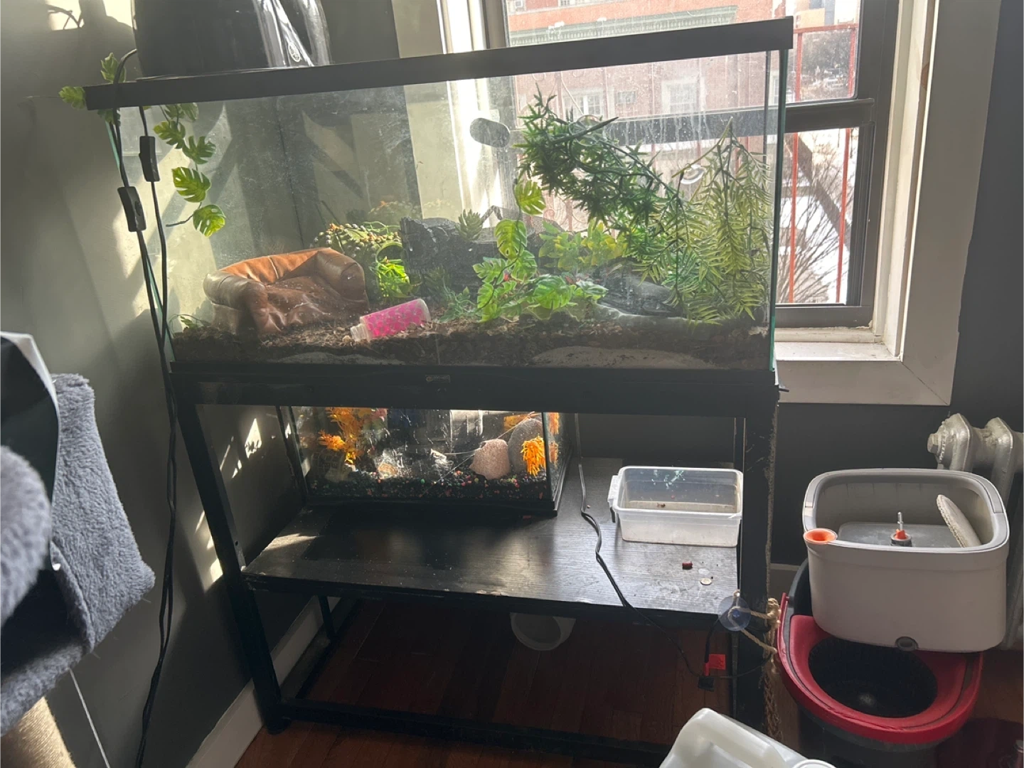 Spacious glass terrarium tank, perfect for reptiles or small animals. Comes with a sturdy metal stand for elevated display. Includes artificial plants and a basking platform. Great for creating a comfortable habitat!