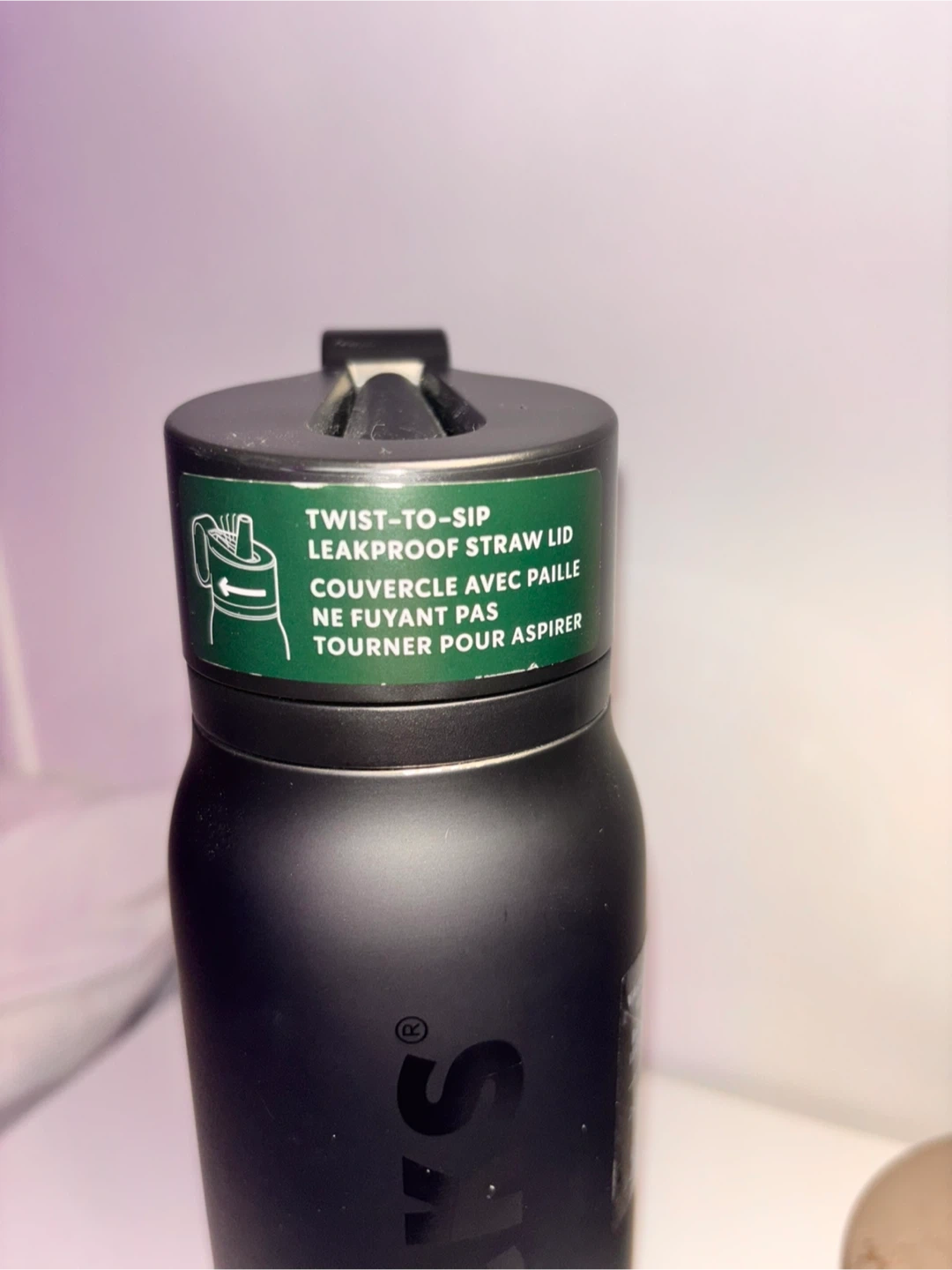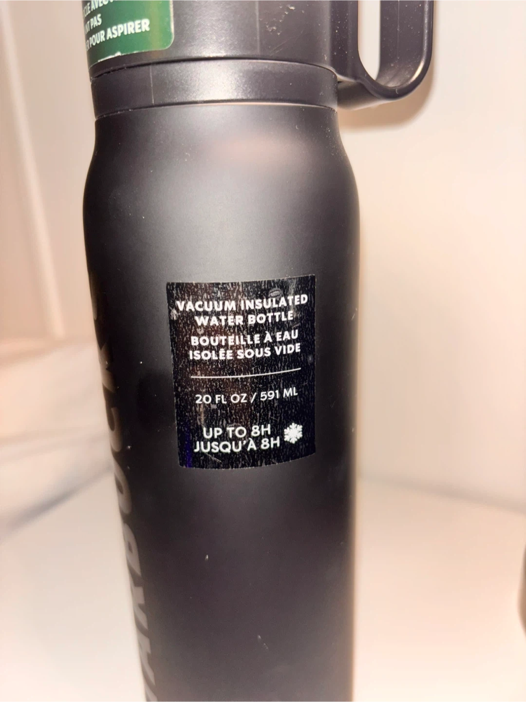 Starbucks vacuum insulated water bottle in black. It's a 20 oz (591 ml) bottle. The lid is a twist-to-sip, leakproof straw lid. It keeps drinks cold for up to 8 hours. One little scratch