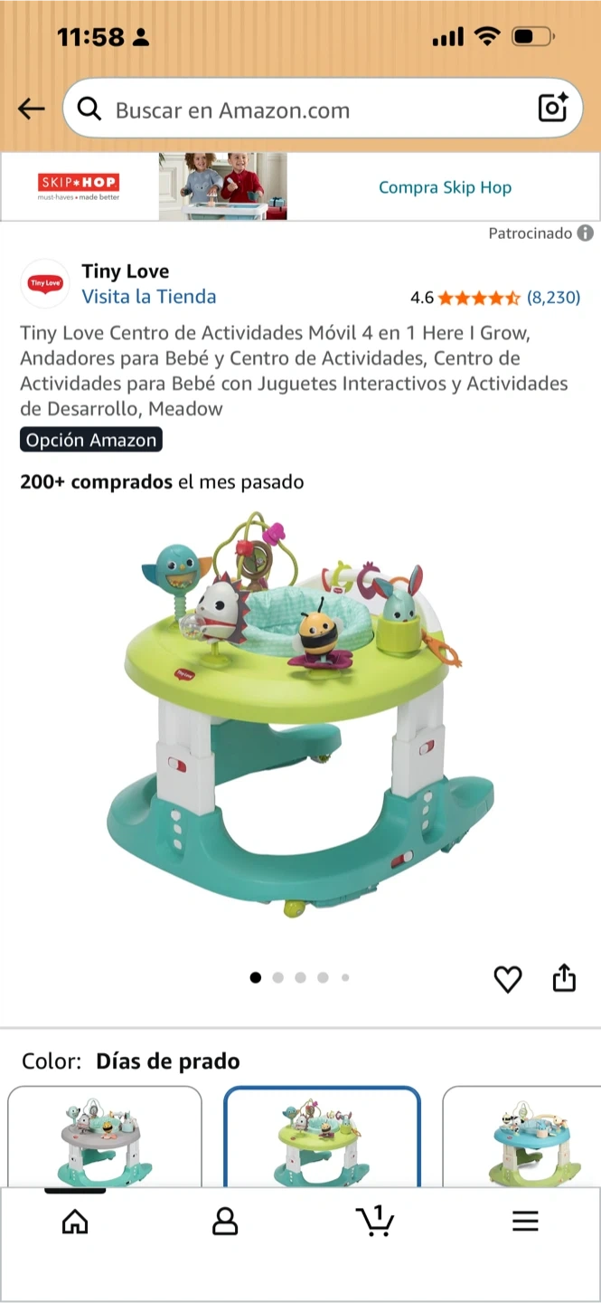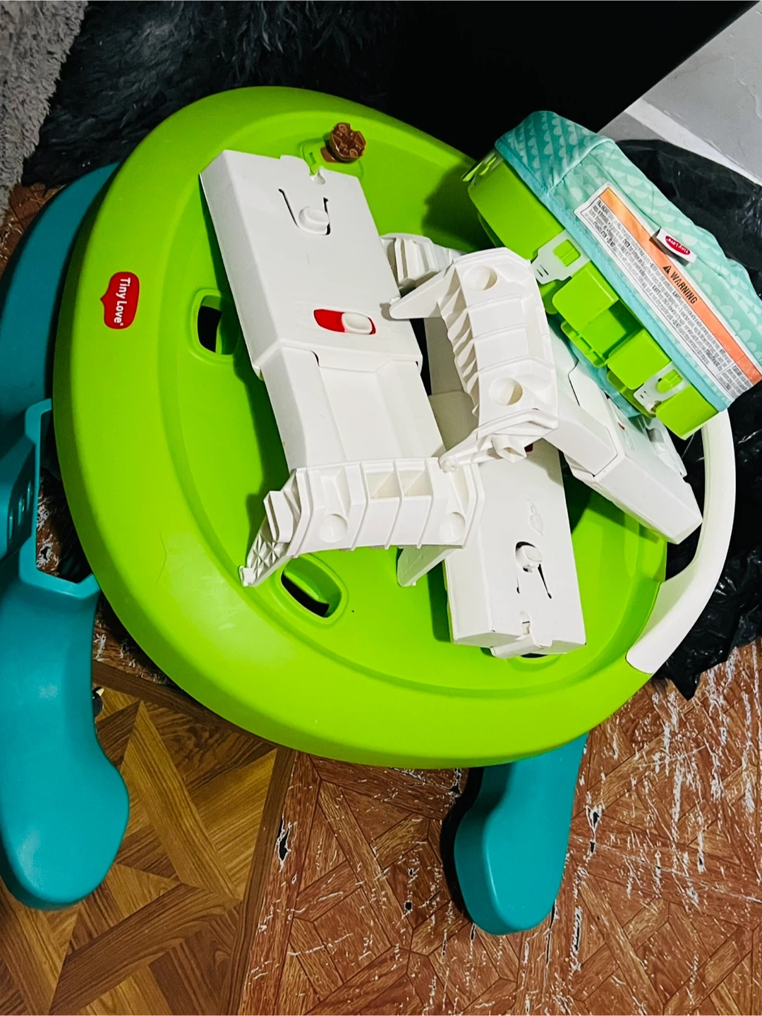 This Tiny Love activity center features a 4-in-1 design with swivel, push, bounce, and walk modes. It's designed for babies and toddlers. Includes multiple interactive toys.