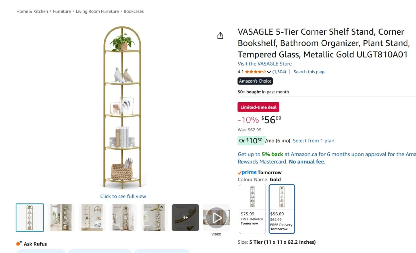 This VASAGLE corner shelf unit features five tiers with tempered glass.