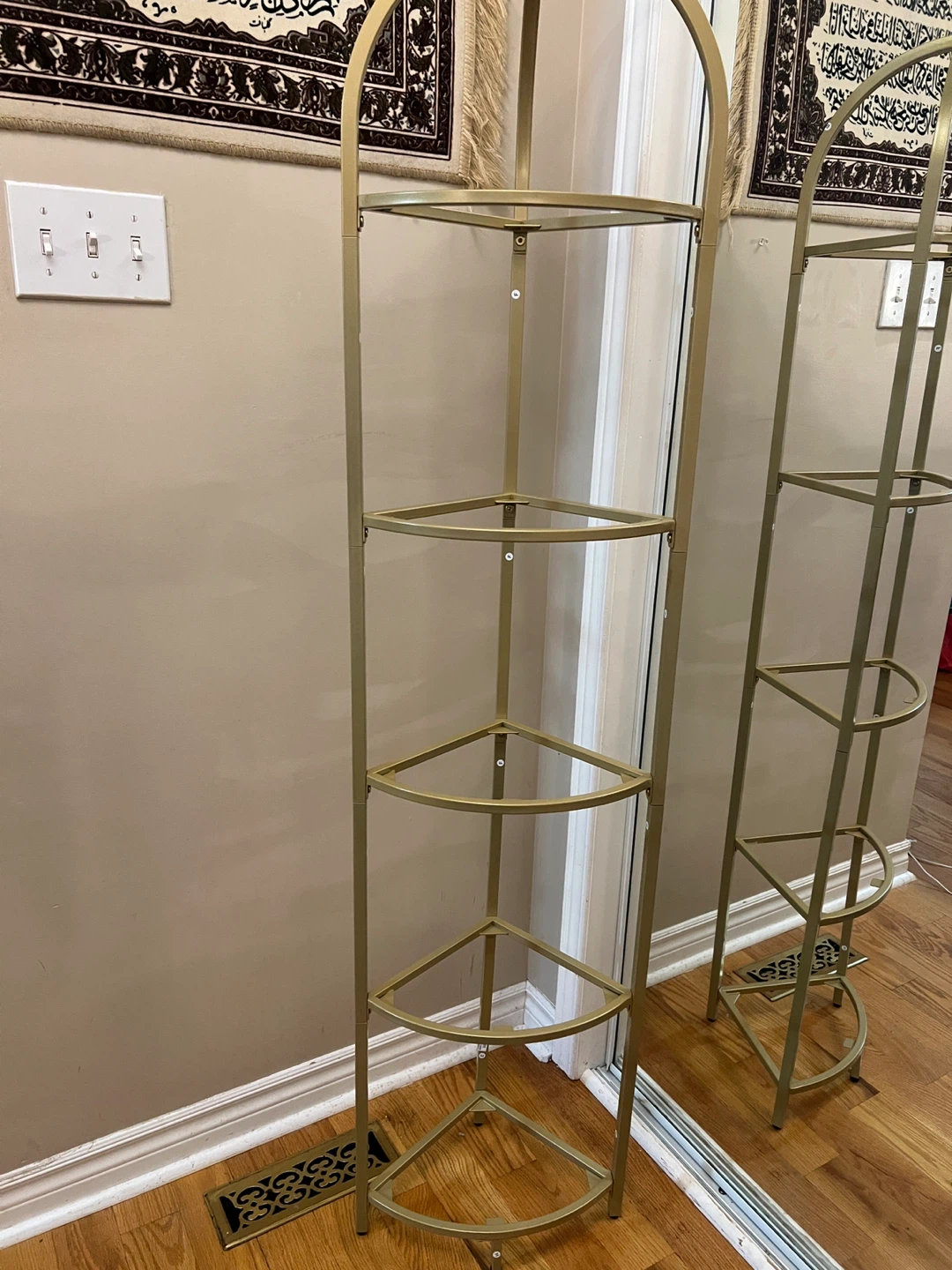 It's a metallic gold finish and has an arched top. Comes with assembly hardware.