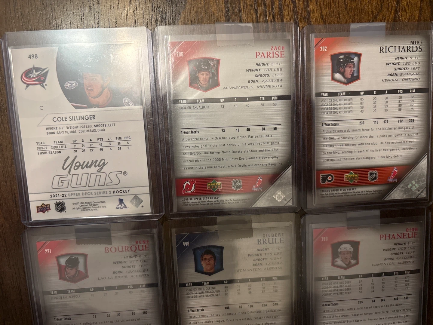 Collection of Upper Deck hockey cards featuring Young Guns and Rookie Cards.