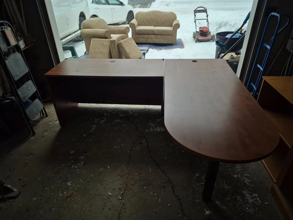 1x Reception desk (L-shaped): 6' long each way, 2' wide top, 30" tall. 1x Executive desk (L-shaped): 6' long one way, 7' long the other way. The 6' side is 30" wide, the 7' side is 24" wide. Both desks are 30" tall. Includes 3 matching file cabinets (wood veneer finish), designed to fit under the desks. Cabinet dimensions: 21.5" x 16.5" x 28". $450 obo.